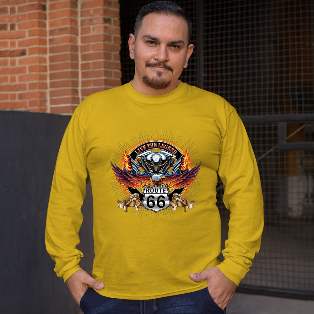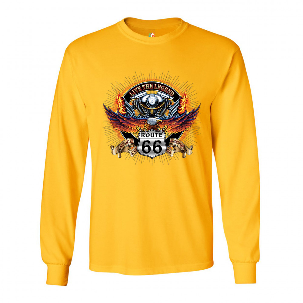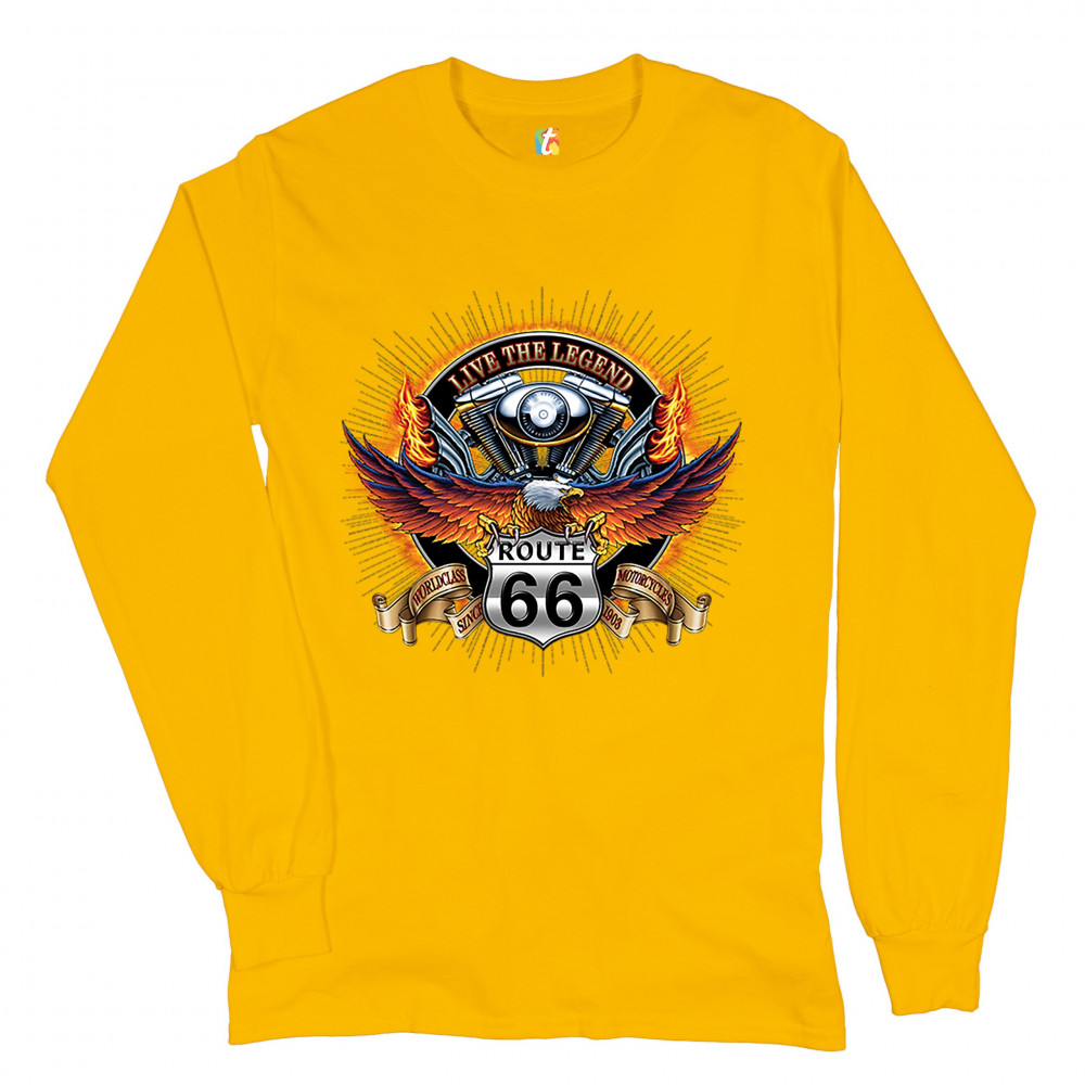 A print featuring an American bald eagle spreading it's wings while sitting on a "Route 66" sign. On a stripe behind the sign it says: "worldclass motorcycles since 1903". In the background there is a motorcycle engine with words: "live the legend" above