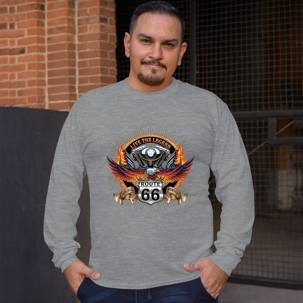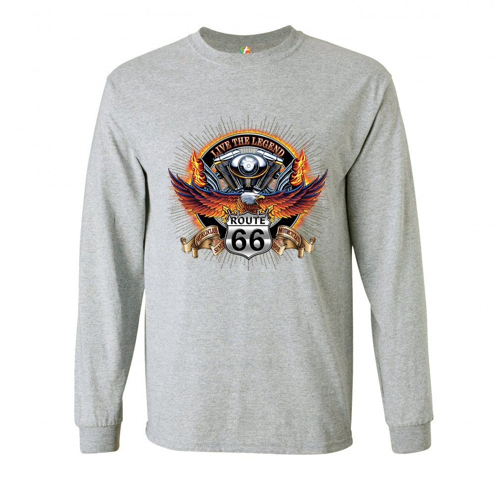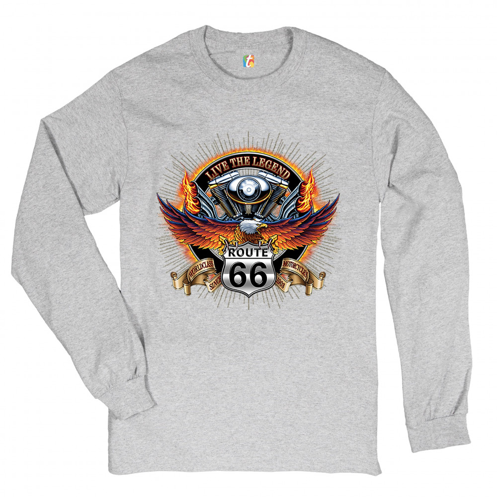 A print featuring an American bald eagle spreading it's wings while sitting on a "Route 66" sign. On a stripe behind the sign it says: "worldclass motorcycles since 1903". In the background there is a motorcycle engine with words: "live the legend" above