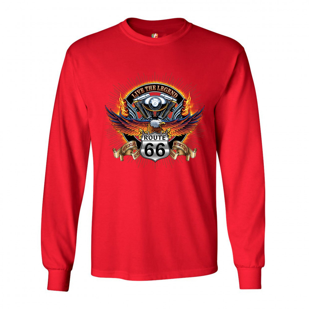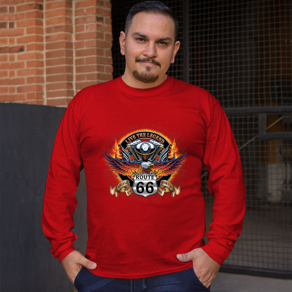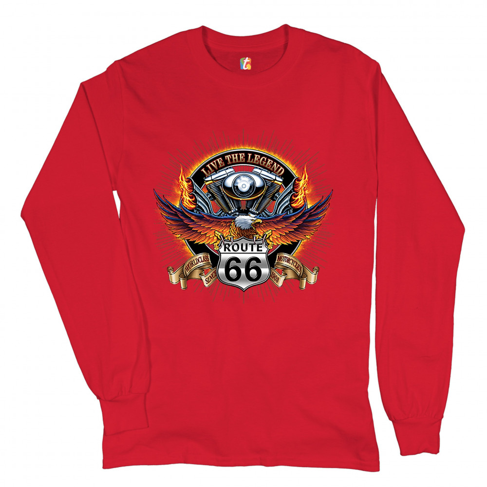 A print featuring an American bald eagle spreading it's wings while sitting on a "Route 66" sign. On a stripe behind the sign it says: "worldclass motorcycles since 1903". In the background there is a motorcycle engine with words: "live the legend" above