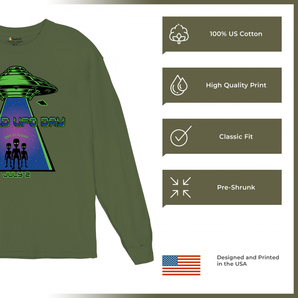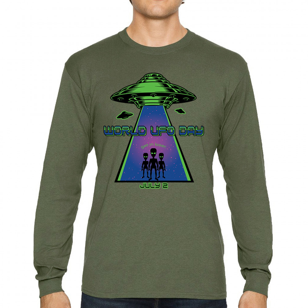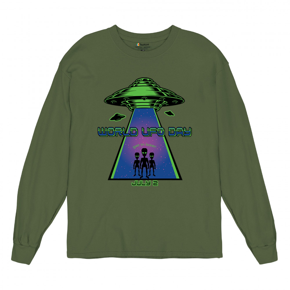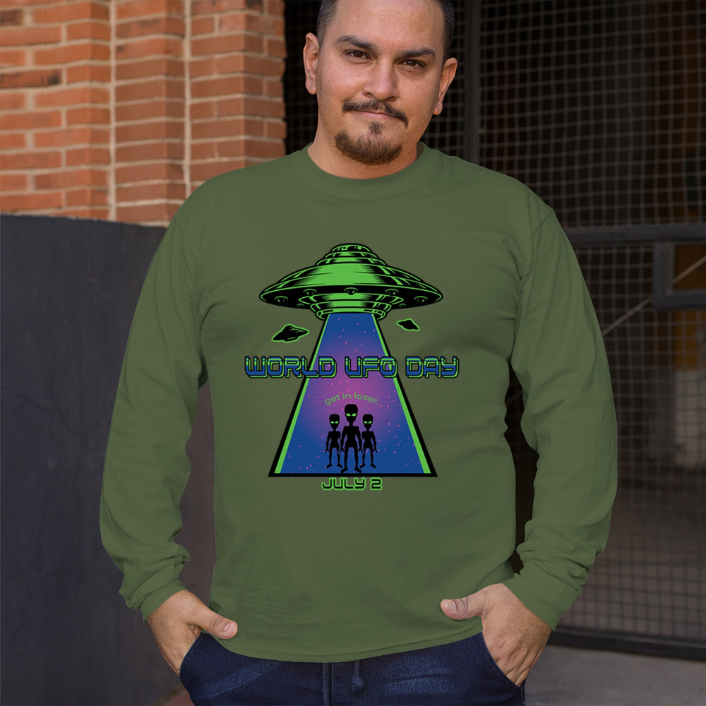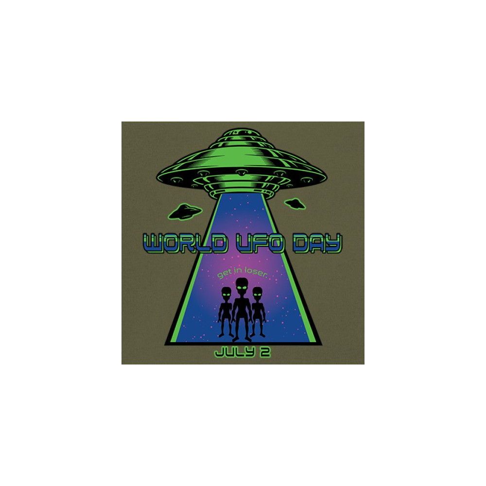 Join the celebration of World UFO Day with this unique design, featuring a detailed UFO beaming up three cheerful aliens with the phrase "Get in, loser." Perfect for those who are fascinated by the unknown and have a sense of humor about extraterrestrial life. Whether you're attending a UFO event, meeting with fellow enthusiasts, or just want to express your quirky style, this design is a must-have. Embrace the spirit of curiosity and fun with this eye-catching design for July 2nd.