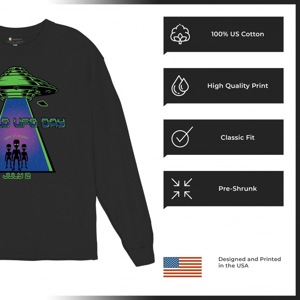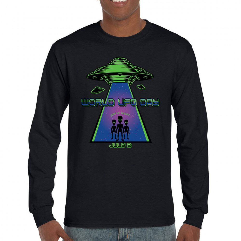 WORLD UFO DAY GET IN LOSER long sleeve t-shirt funny aliens flying saucer space black