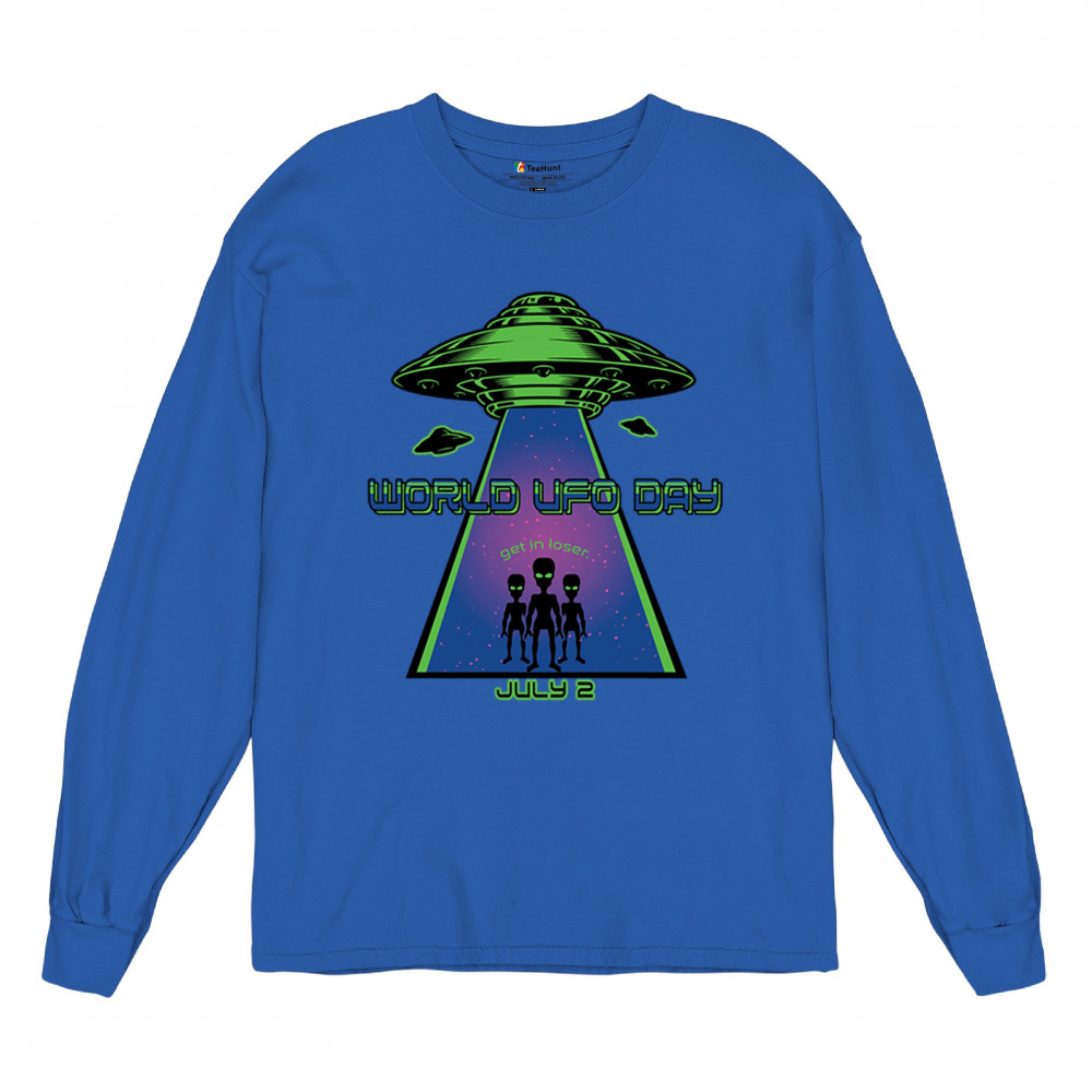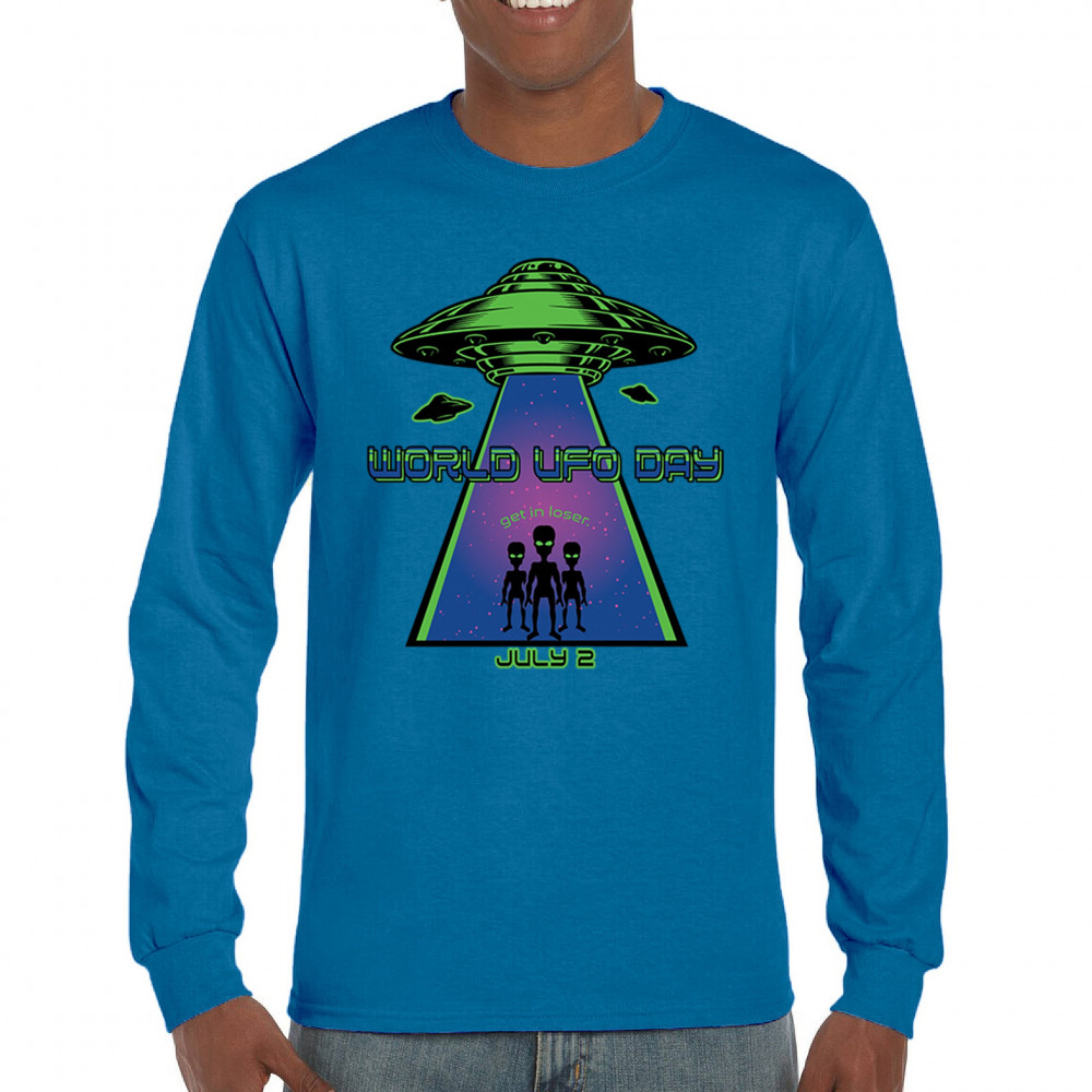Join the celebration of World UFO Day with this unique design, featuring a detailed UFO beaming up three cheerful aliens with the phrase "Get in, loser." Perfect for those who are fascinated by the unknown and have a sense of humor about extraterrestrial life. Whether you're attending a UFO event, meeting with fellow enthusiasts, or just want to express your quirky style, this design is a must-have. Embrace the spirit of curiosity and fun with this eye-catching design for July 2nd.