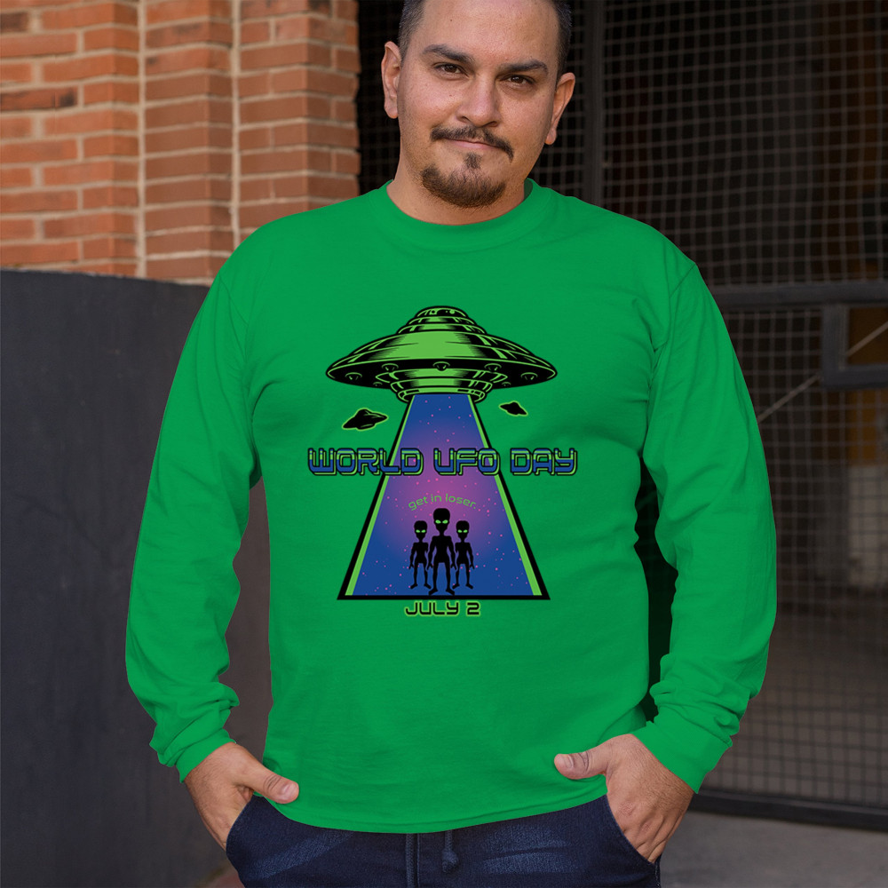 Join the celebration of World UFO Day with this unique design, featuring a detailed UFO beaming up three cheerful aliens with the phrase "Get in, loser." Perfect for those who are fascinated by the unknown and have a sense of humor about extraterrestrial life. Whether you're attending a UFO event, meeting with fellow enthusiasts, or just want to express your quirky style, this design is a must-have. Embrace the spirit of curiosity and fun with this eye-catching design for July 2nd.