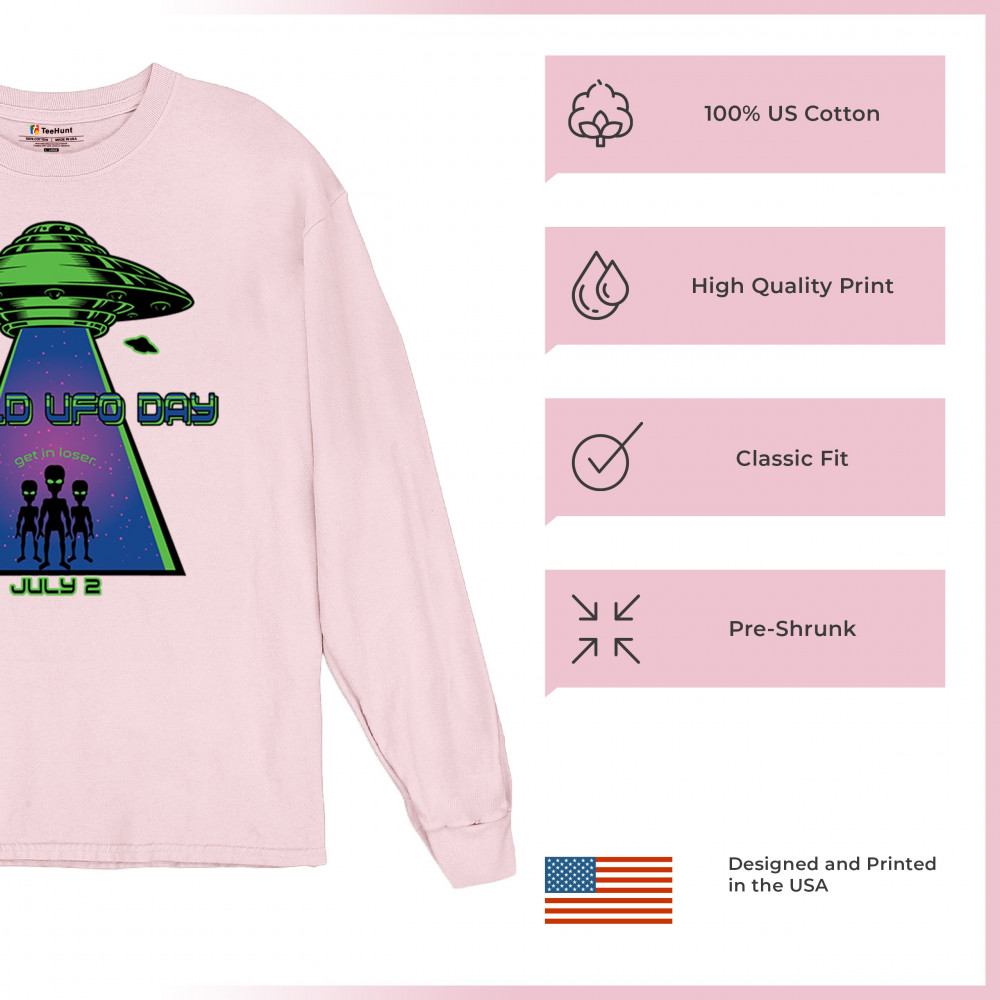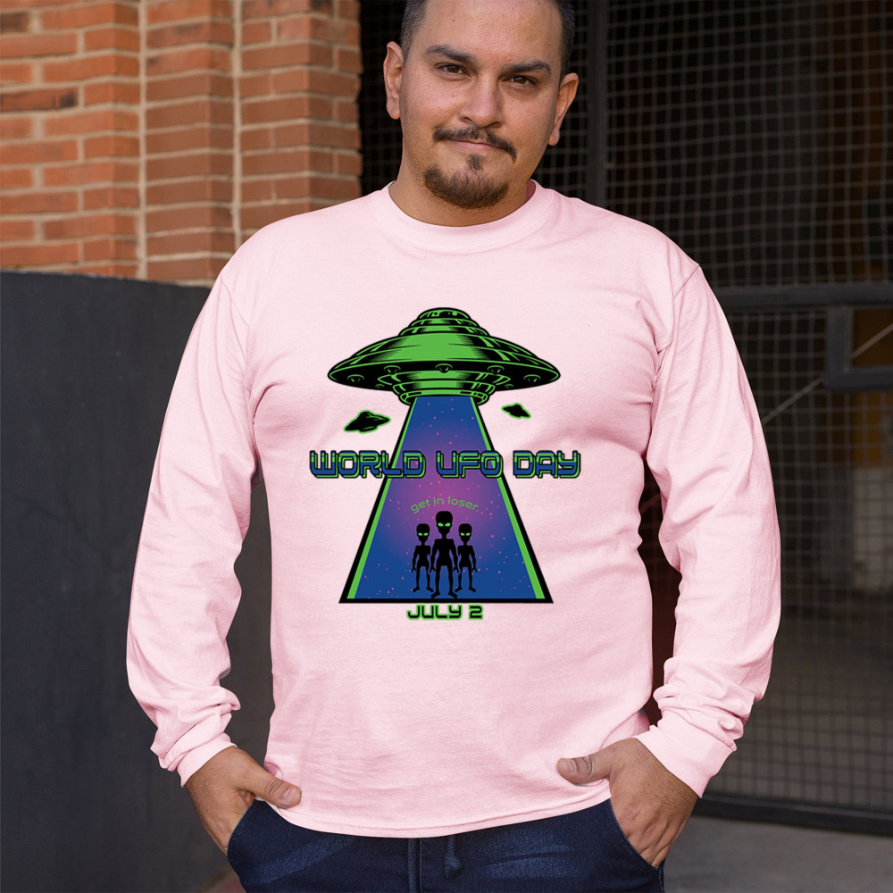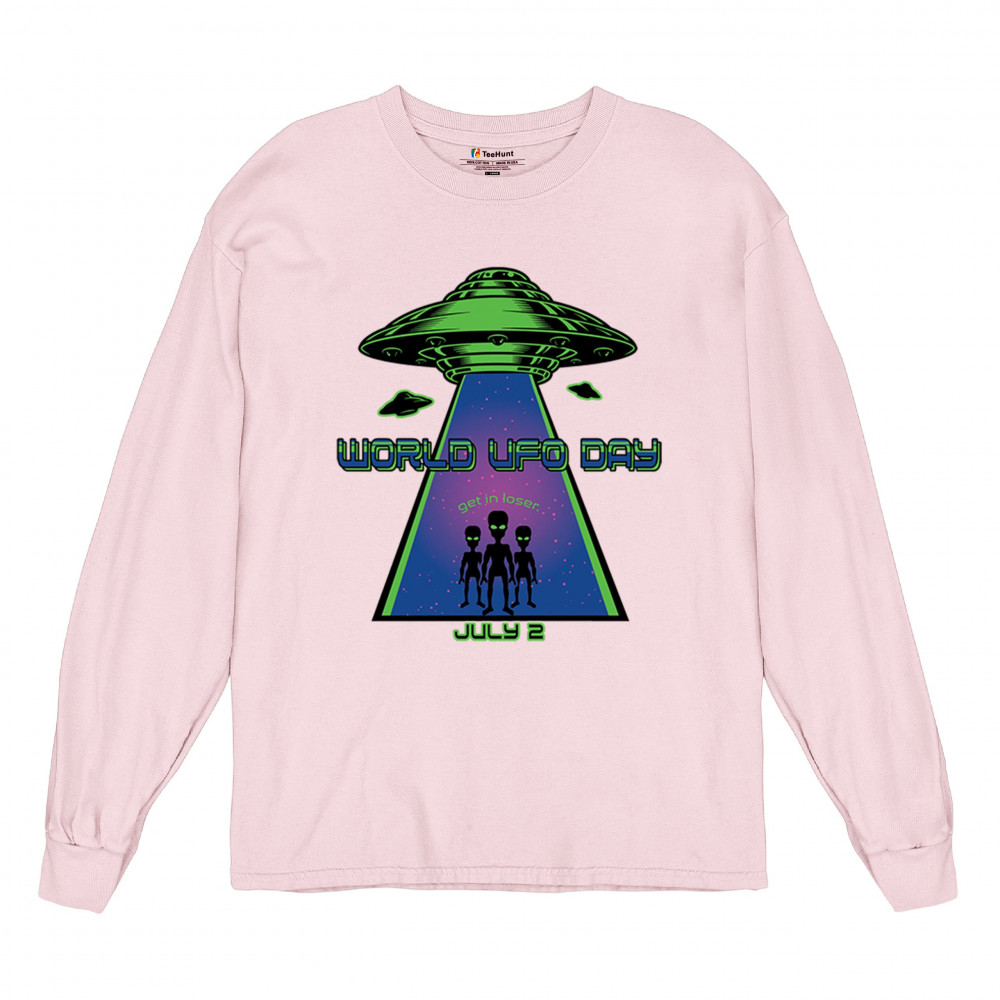 Join the celebration of World UFO Day with this unique design, featuring a detailed UFO beaming up three cheerful aliens with the phrase "Get in, loser." Perfect for those who are fascinated by the unknown and have a sense of humor about extraterrestrial life. Whether you're attending a UFO event, meeting with fellow enthusiasts, or just want to express your quirky style, this design is a must-have. Embrace the spirit of curiosity and fun with this eye-catching design for July 2nd.