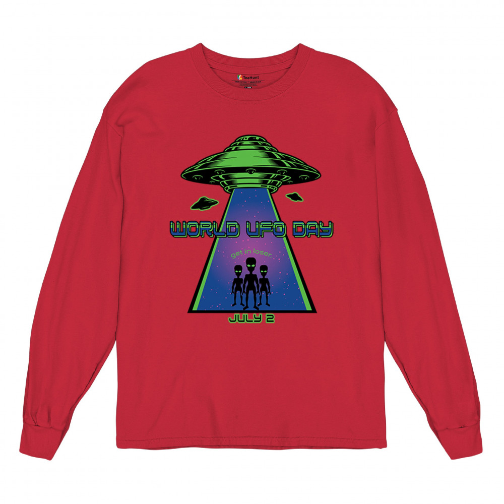 Celebrate World UFO Day with a vibrant design featuring a UFO and three playful aliens with "Get in, loser." Perfect for UFO enthusiasts and alien humor lovers.
