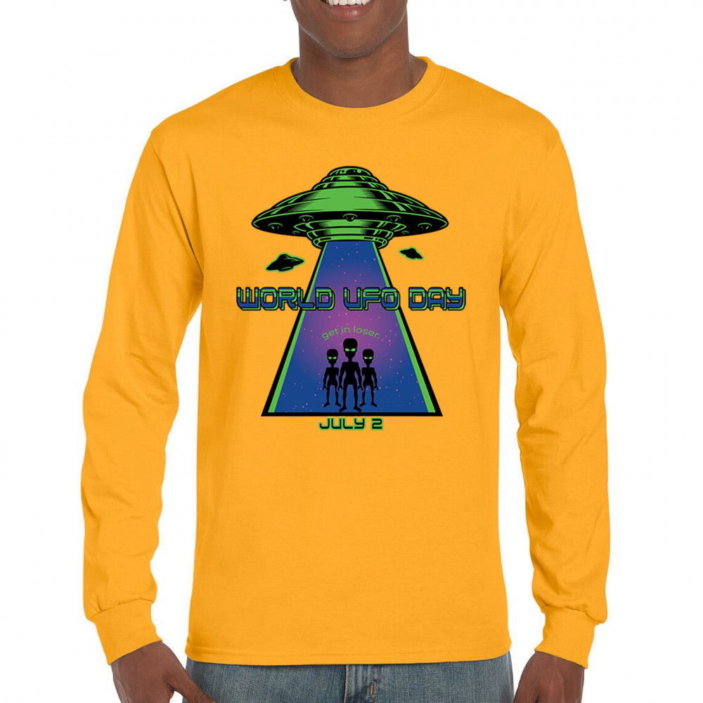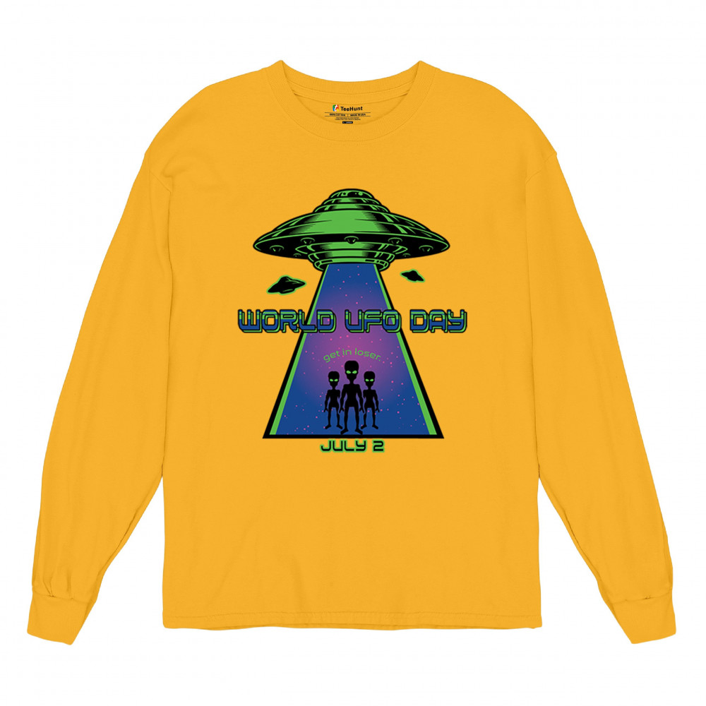 Join the celebration of World UFO Day with this unique design, featuring a detailed UFO beaming up three cheerful aliens with the phrase "Get in, loser." Perfect for those who are fascinated by the unknown and have a sense of humor about extraterrestrial life. Whether you're attending a UFO event, meeting with fellow enthusiasts, or just want to express your quirky style, this design is a must-have. Embrace the spirit of curiosity and fun with this eye-catching design for July 2nd.