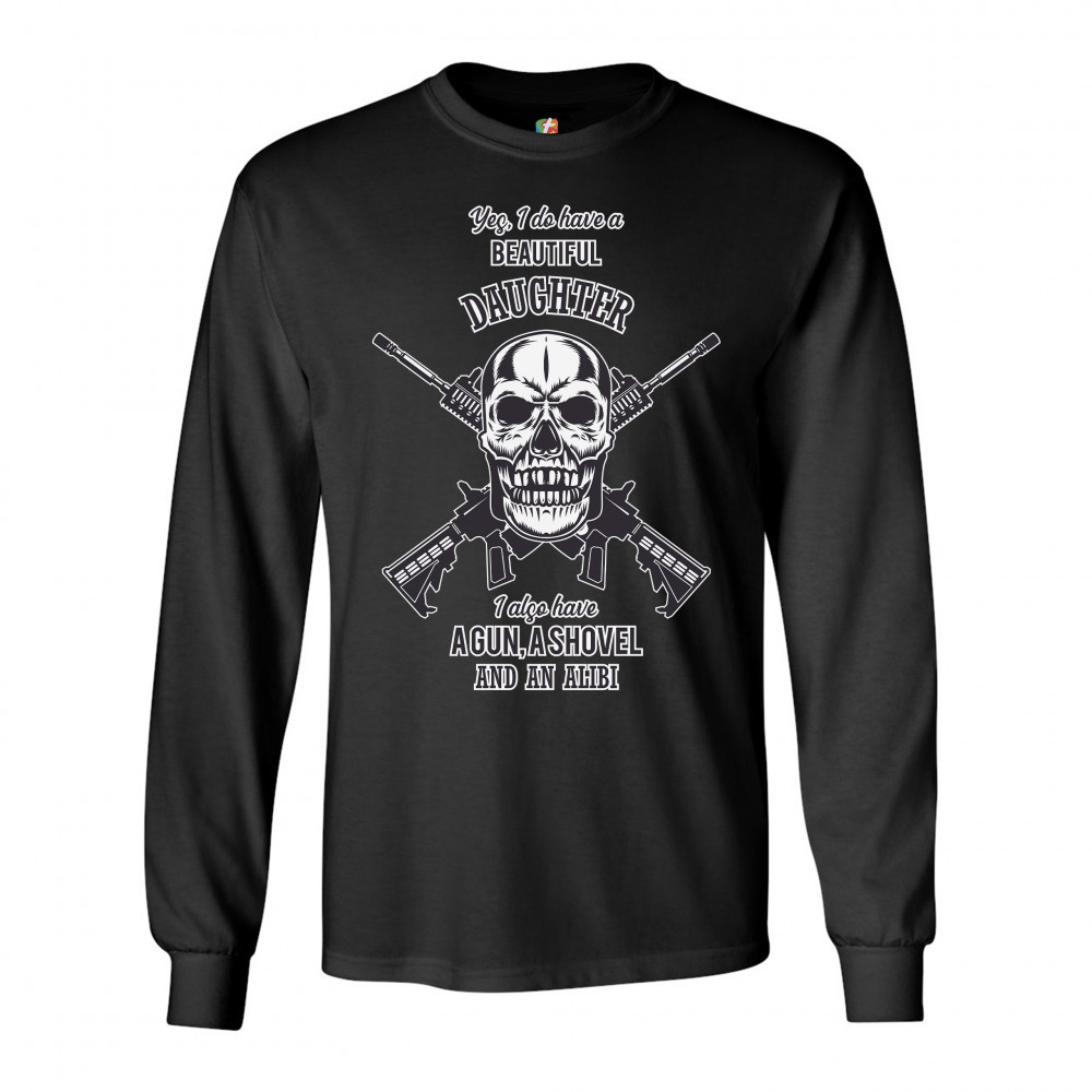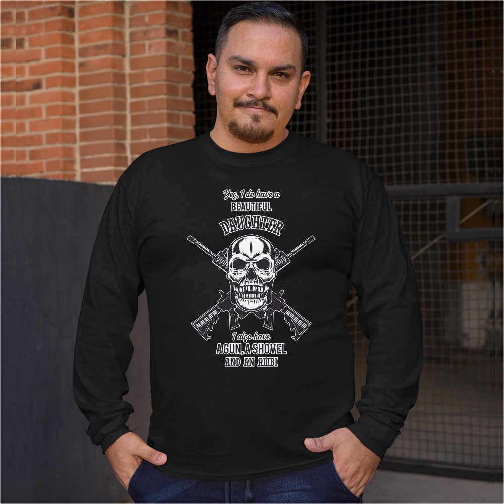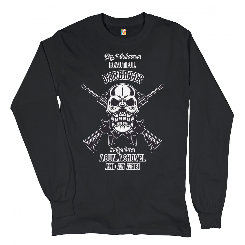 A funny print featuring a scary skull facing forward; behind it there are two crossed rifles. The print says: "Yes, I do have a beautiful daughter. I also have a gun, a shovel and an alibi". Great choice as a gift for Father's Day celebration.