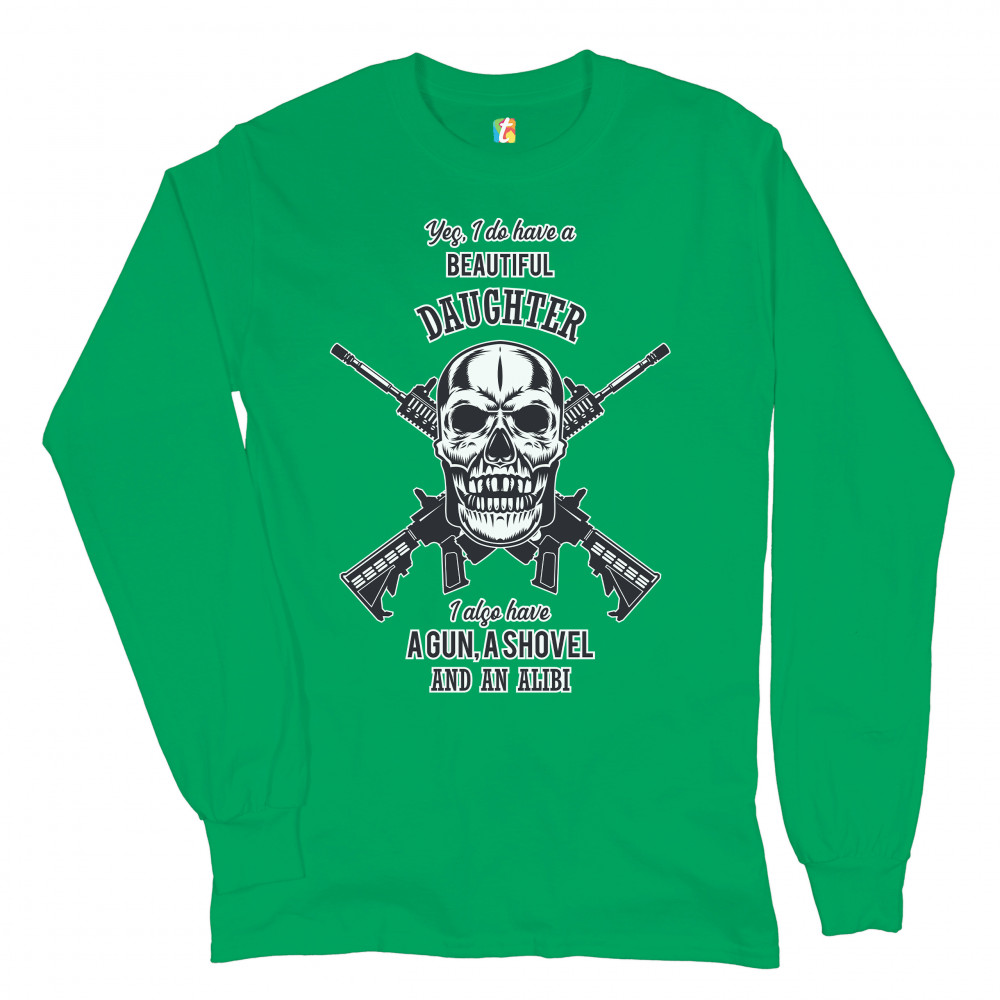 A funny print featuring a scary skull facing forward; behind it there are two crossed rifles. The print says: "Yes, I do have a beautiful daughter. I also have a gun, a shovel and an alibi". Great choice as a gift for Father's Day celebration.