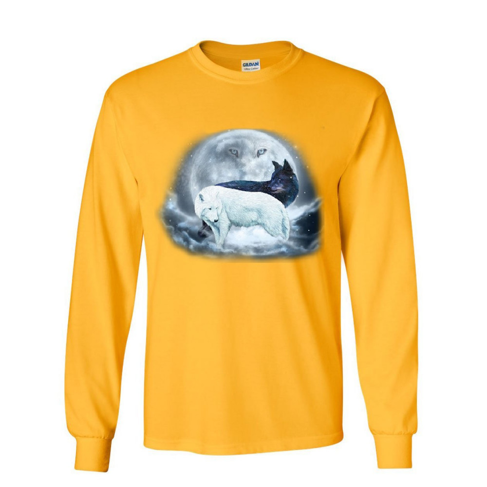 YIN & YANG WOLVES long sleeve t-shirt animals wildlife nature wolf pack moon tee yellow