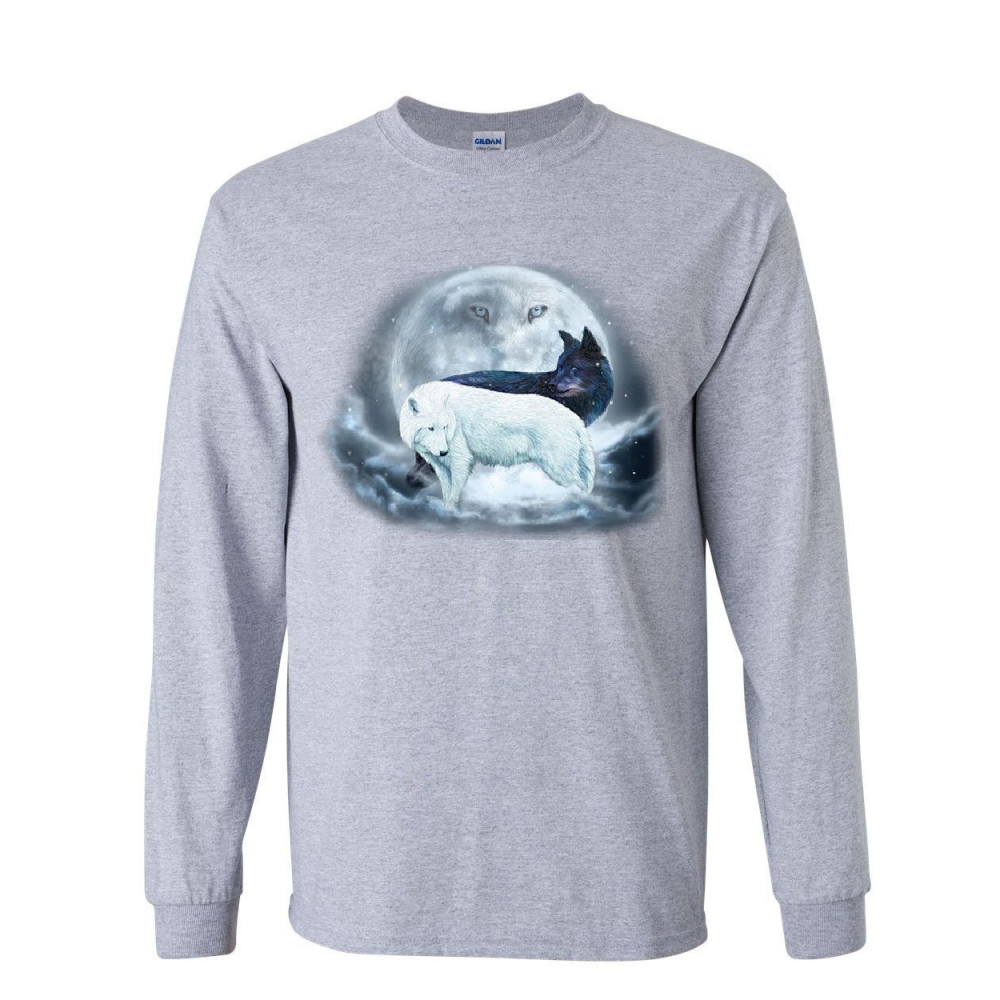 YIN & YANG WOLVES long sleeve t-shirt animals wildlife nature wolf pack moon tee gray