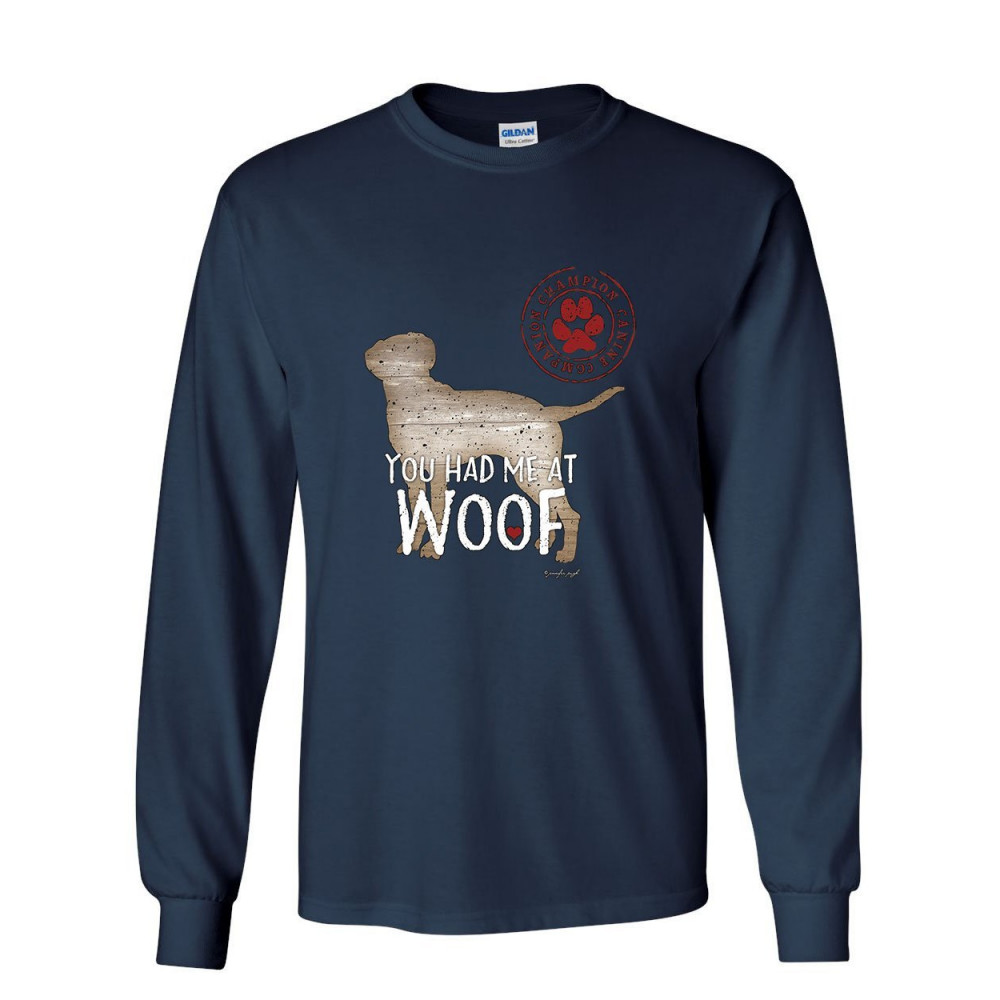 YOU HAD ME AT WOOF long sleeve t-shirt pet friend dogs doggie puppy paw bark tee navy blue