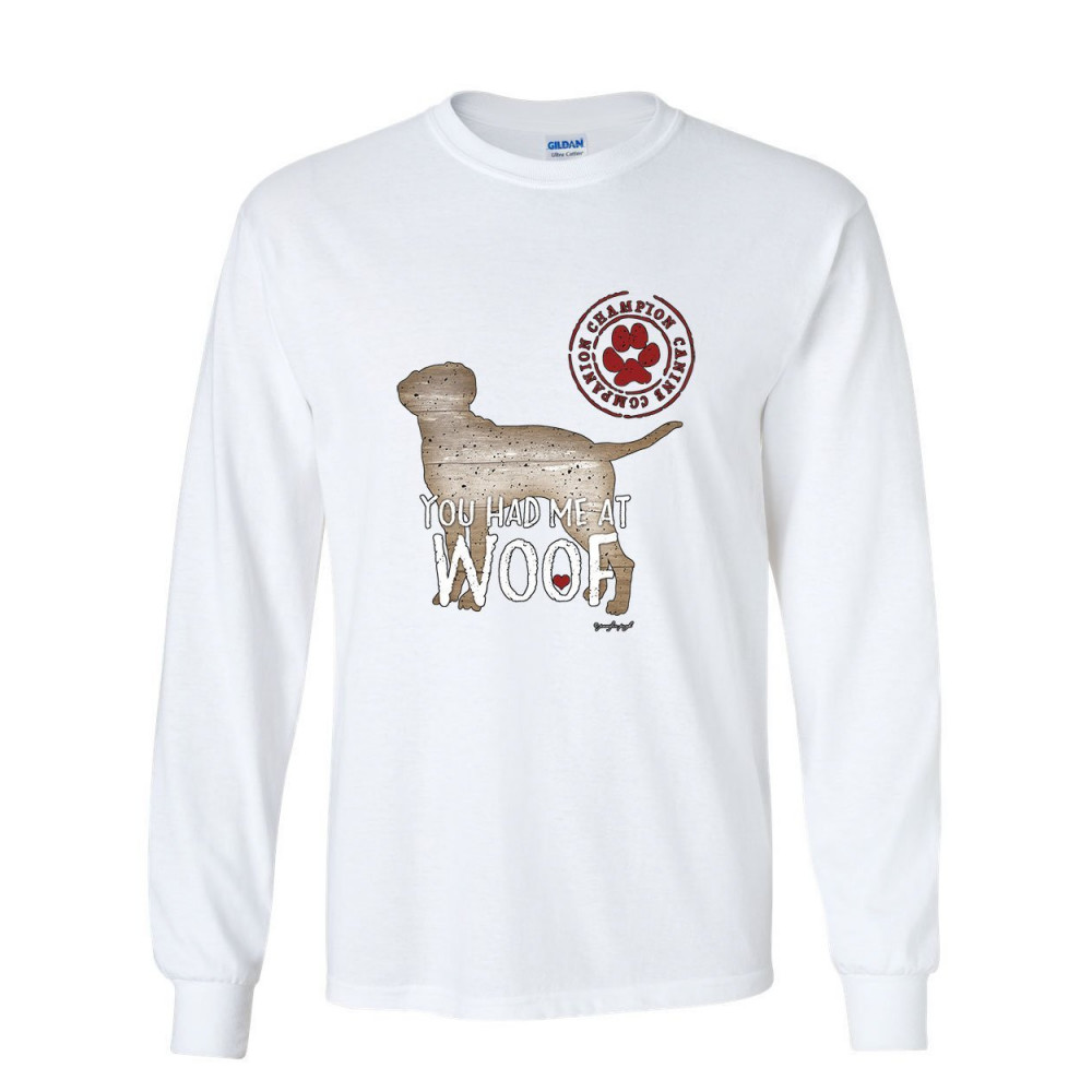 YOU HAD ME AT WOOF long sleeve t-shirt pet friend dogs doggie puppy paw bark tee white