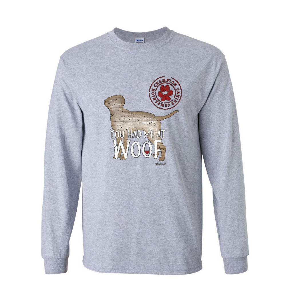 YOU HAD ME AT WOOF long sleeve t-shirt pet friend dogs doggie puppy paw bark tee gray