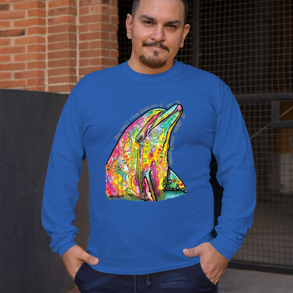 YOU ONLY LIVE ONCE long sleeve t-shirt cute neon dolphin dean russo yolo royal blue