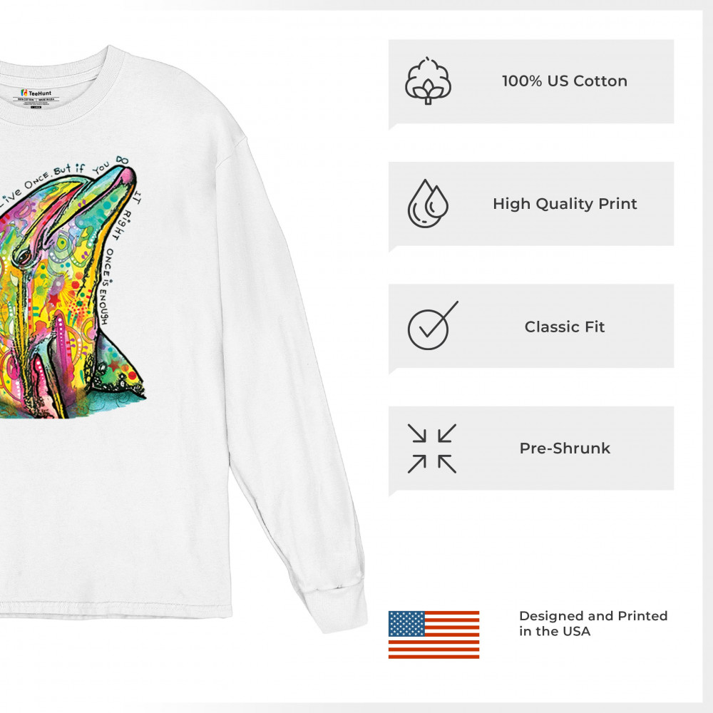 YOU ONLY LIVE ONCE long sleeve t-shirt cute neon dolphin dean russo yolo white