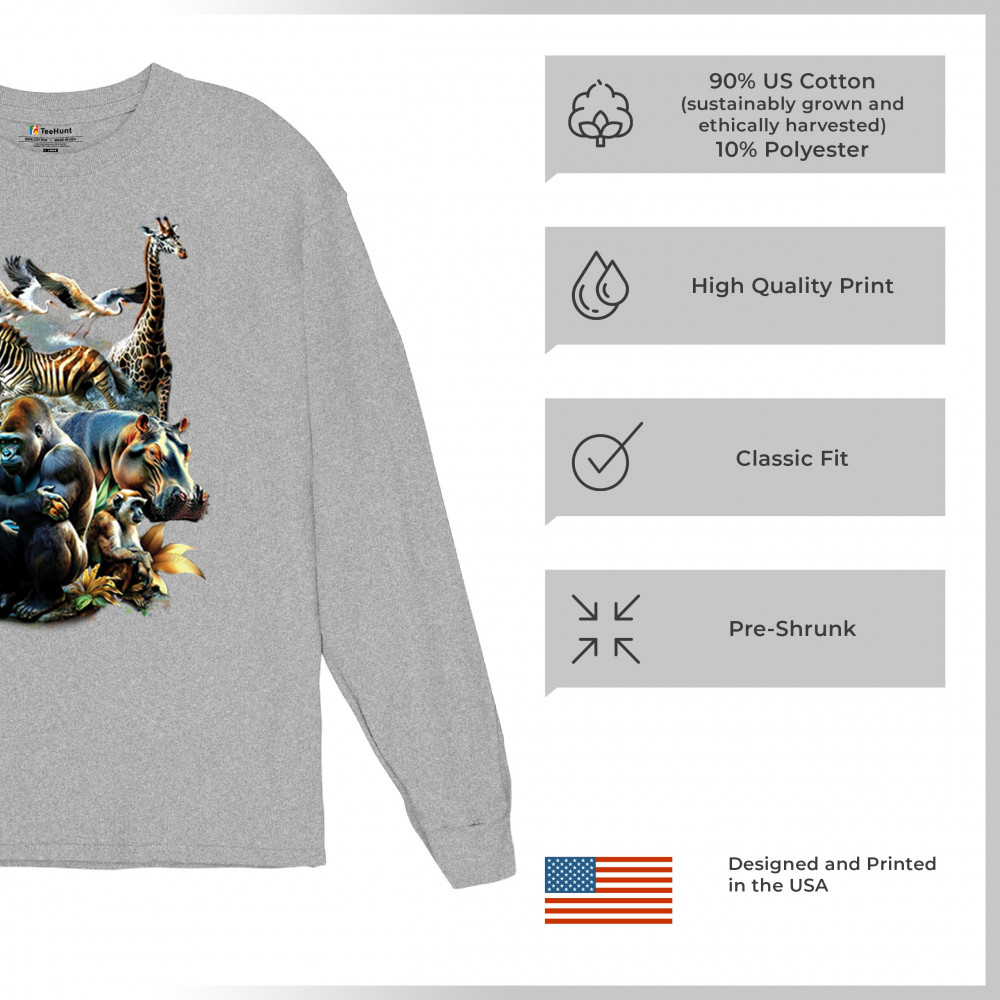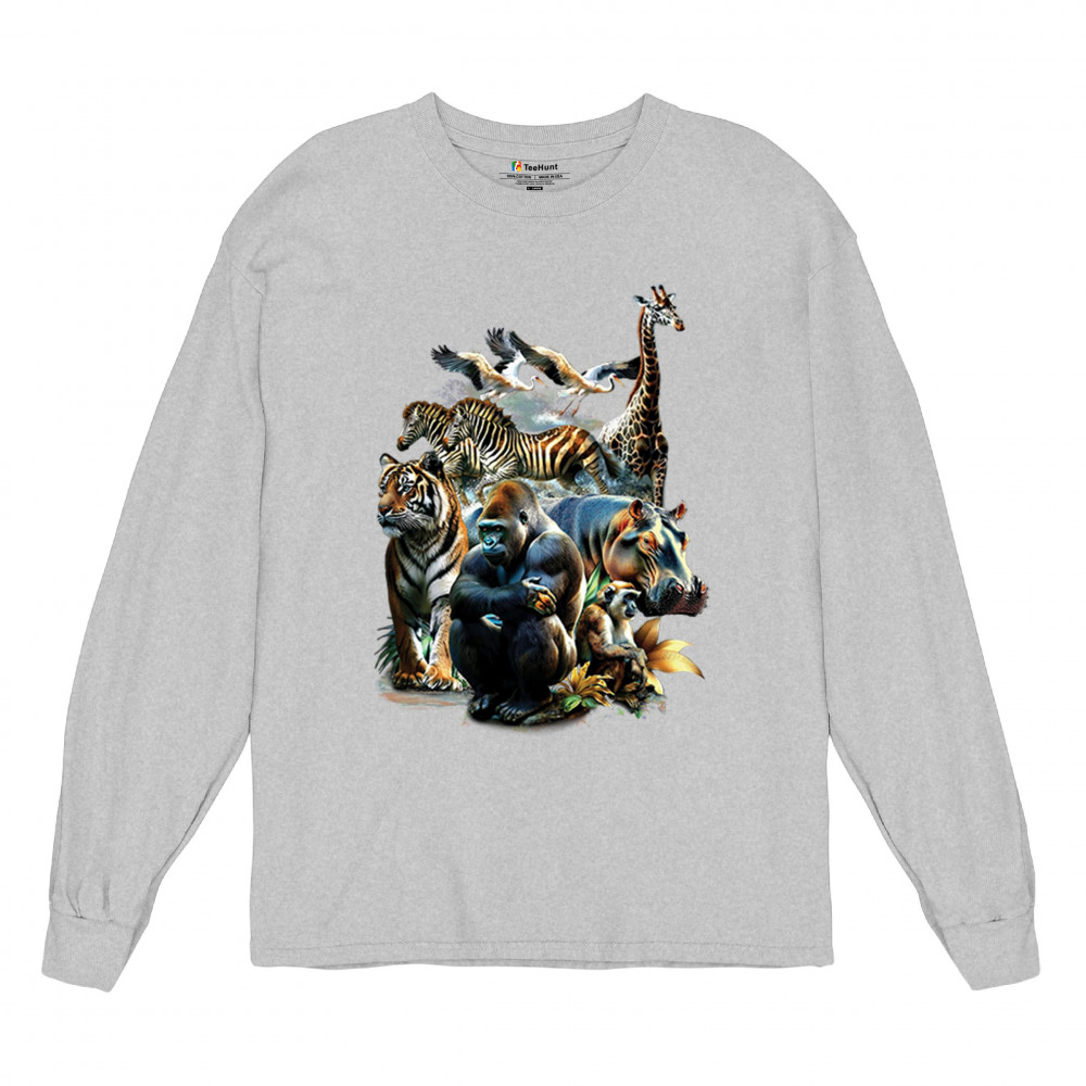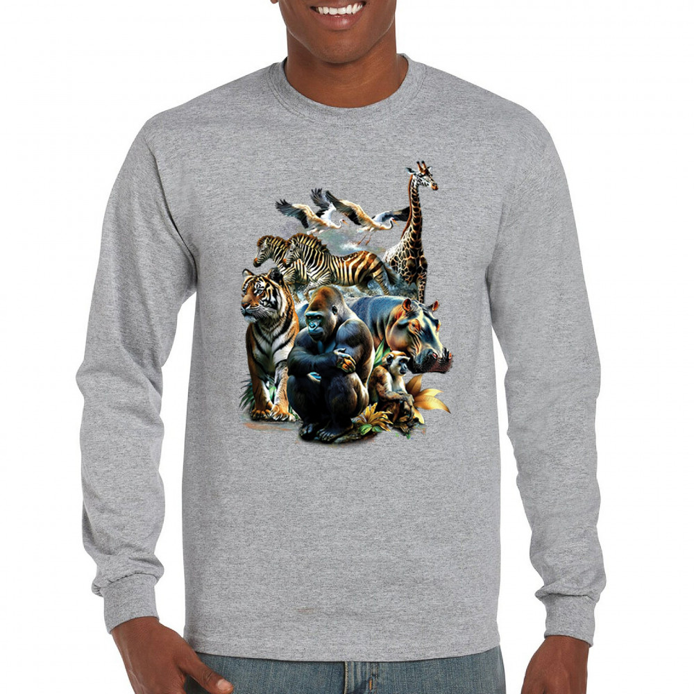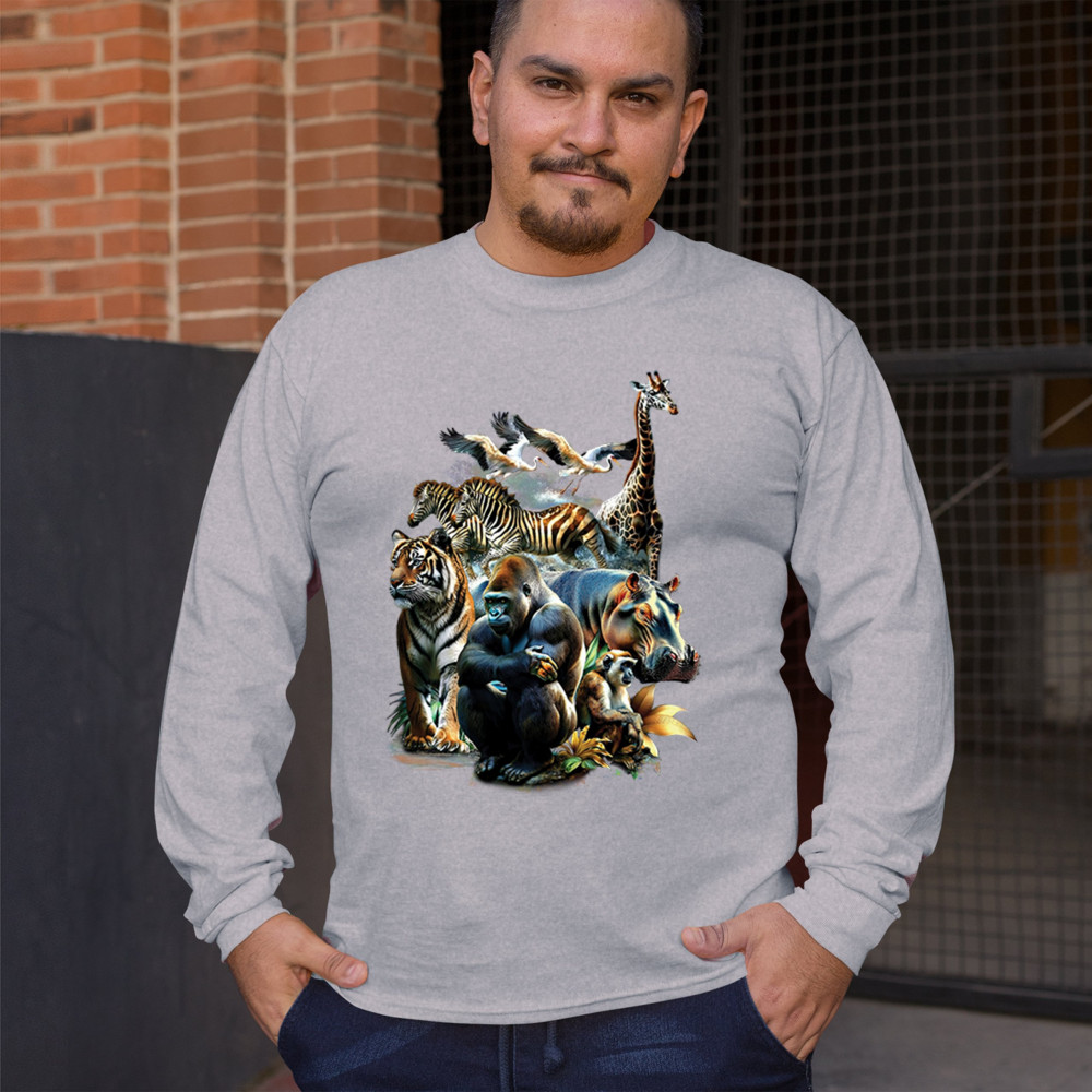 Packed with fierce energy and vibrant color, this wildlife design features a jungle coalition of gorilla, tiger, monkey, zebra, giraffe, hippo, and birds. A powerful tribute to animal beauty, biodiversity, and nature's harmony. Perfect for jungle tour enthusiasts, zoo visitors, or anyone passionate about wild conservation and stunning creature art.