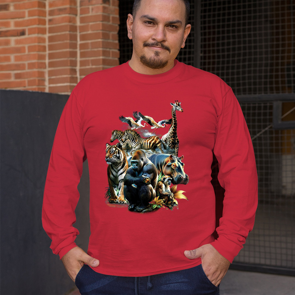 Packed with fierce energy and vibrant color, this wildlife design features a jungle coalition of gorilla, tiger, monkey, zebra, giraffe, hippo, and birds. A powerful tribute to animal beauty, biodiversity, and nature's harmony. Perfect for jungle tour enthusiasts, zoo visitors, or anyone passionate about wild conservation and stunning creature art.