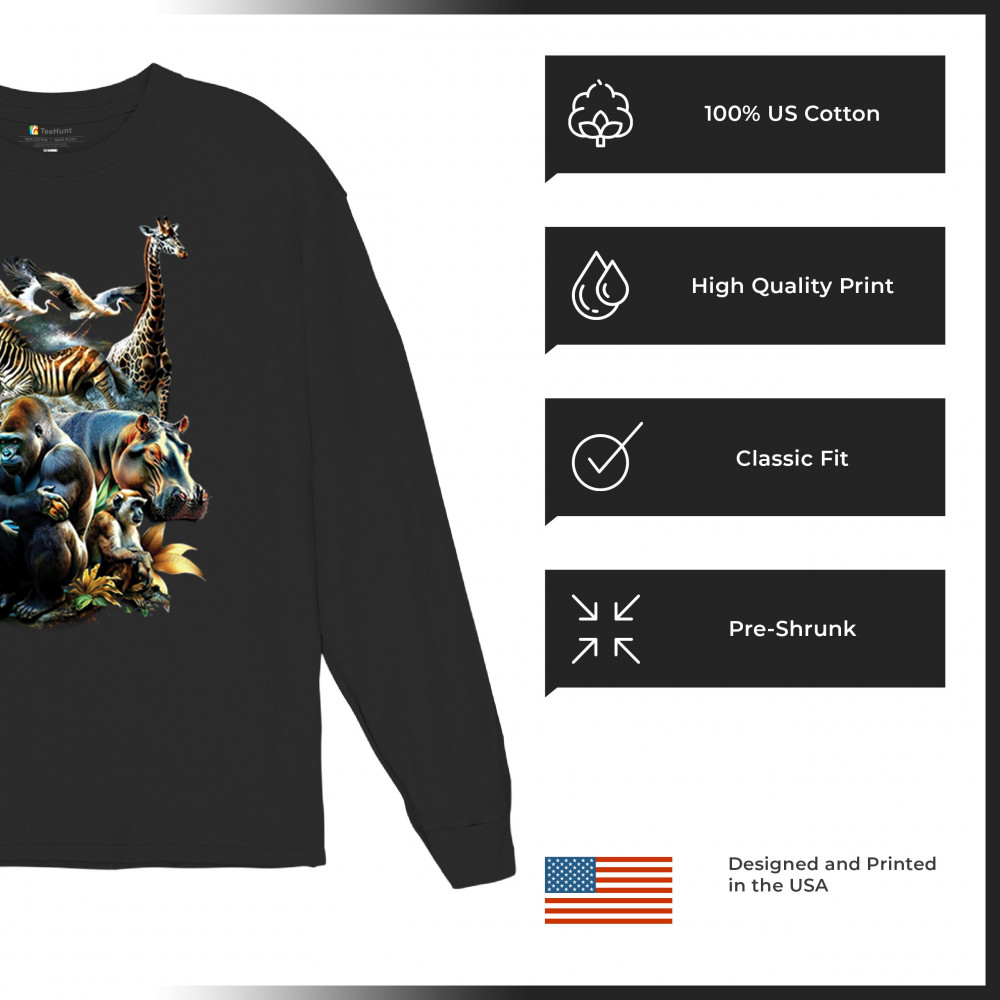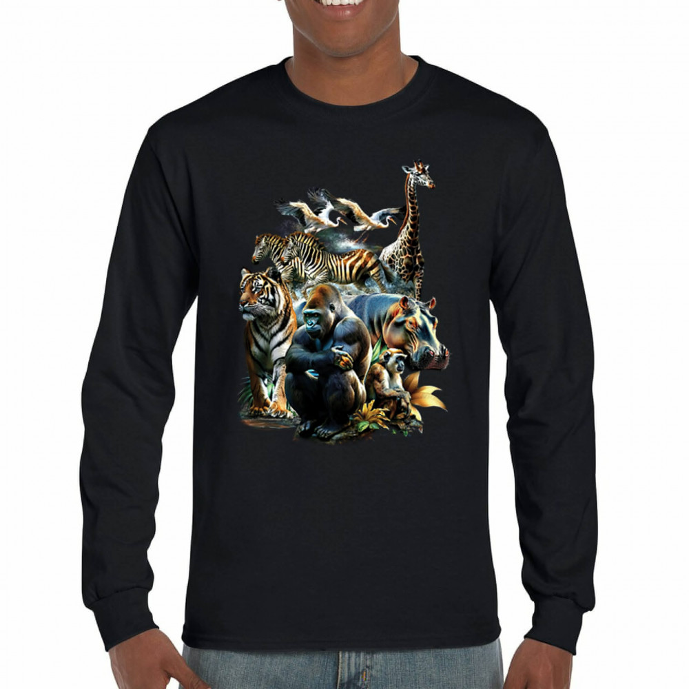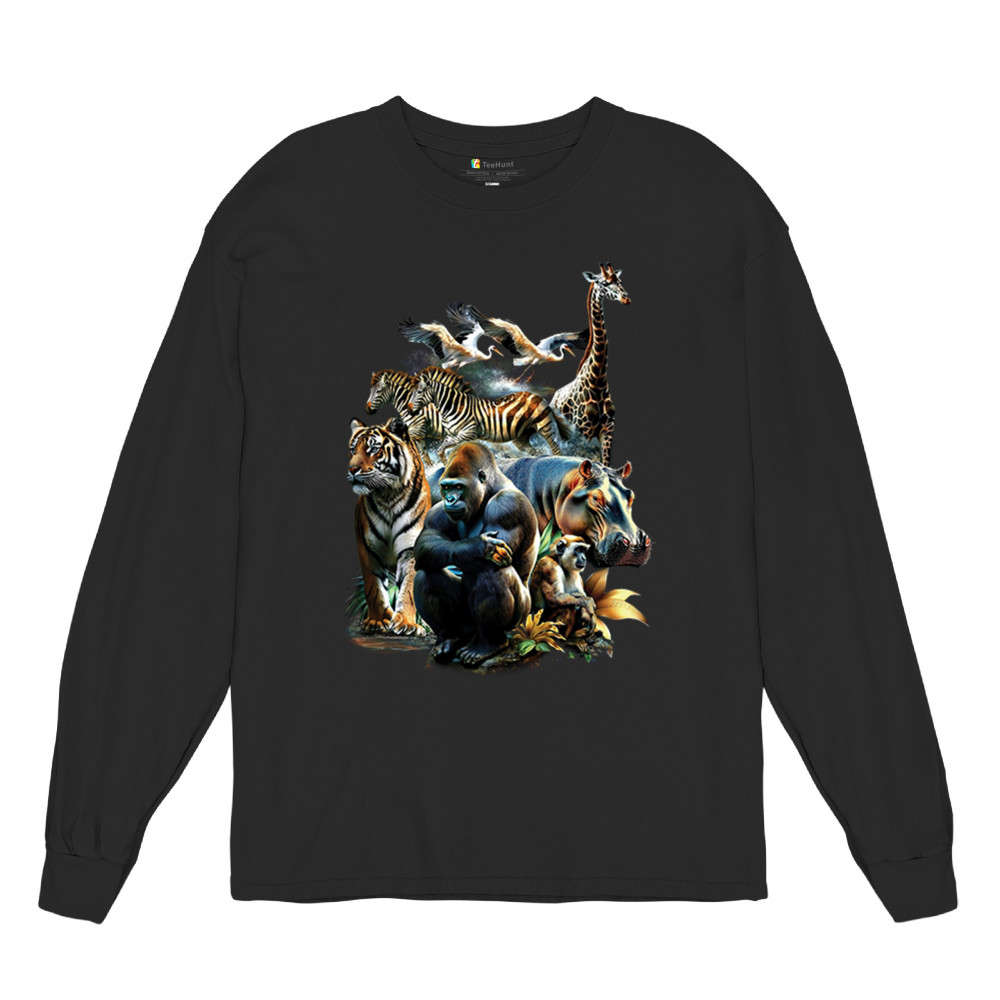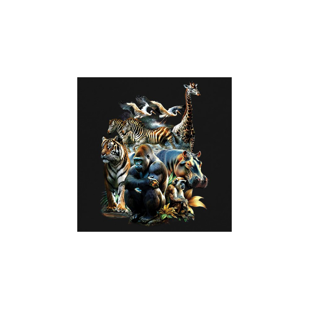 Packed with fierce energy and vibrant color, this wildlife design features a jungle coalition of gorilla, tiger, monkey, zebra, giraffe, hippo, and birds. A powerful tribute to animal beauty, biodiversity, and nature's harmony. Perfect for jungle tour enthusiasts, zoo visitors, or anyone passionate about wild conservation and stunning creature art.
