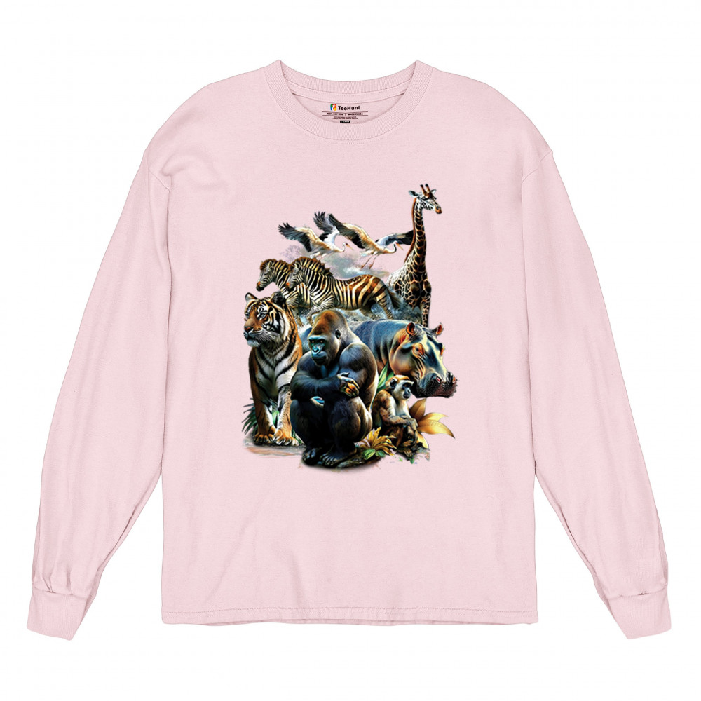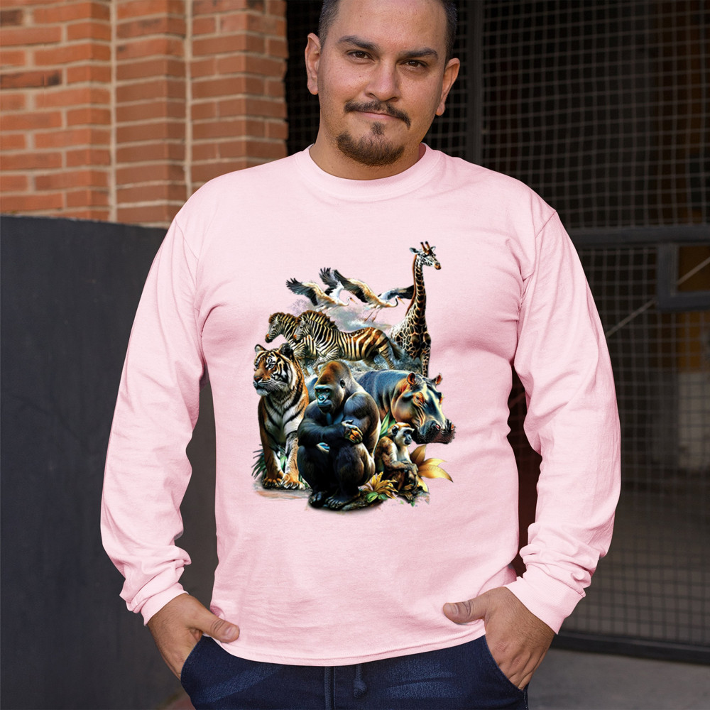 Packed with fierce energy and vibrant color, this wildlife design features a jungle coalition of gorilla, tiger, monkey, zebra, giraffe, hippo, and birds. A powerful tribute to animal beauty, biodiversity, and nature's harmony. Perfect for jungle tour enthusiasts, zoo visitors, or anyone passionate about wild conservation and stunning creature art.