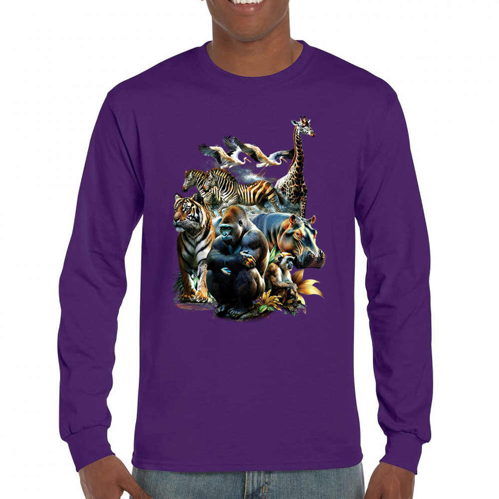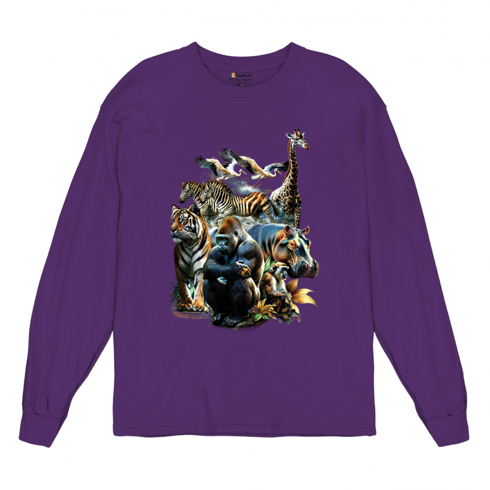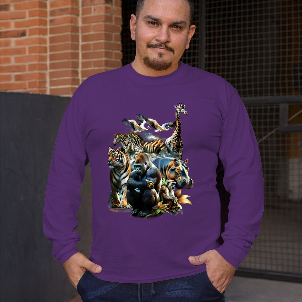 Packed with fierce energy and vibrant color, this wildlife design features a jungle coalition of gorilla, tiger, monkey, zebra, giraffe, hippo, and birds. A powerful tribute to animal beauty, biodiversity, and nature's harmony. Perfect for jungle tour enthusiasts, zoo visitors, or anyone passionate about wild conservation and stunning creature art.