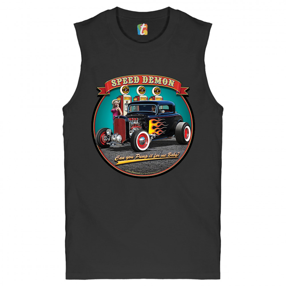 A print featuring a 1932 Ford Deuce hot rod coupe standing by a gas station. There is a cowgirl leaning on a gas pump. The print says: "speed demon" and underneath the car "Can you Pump it for me baby?". A great choice for Route 66 and hot rod fans.