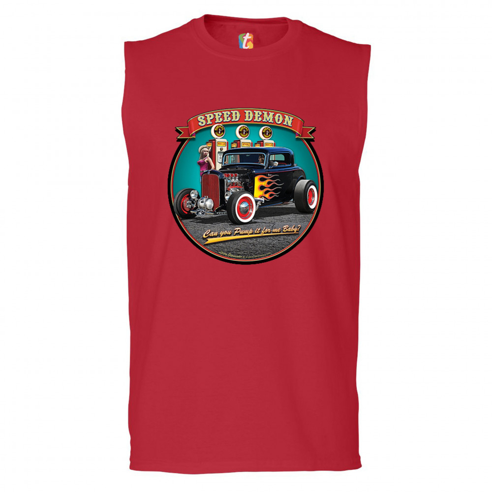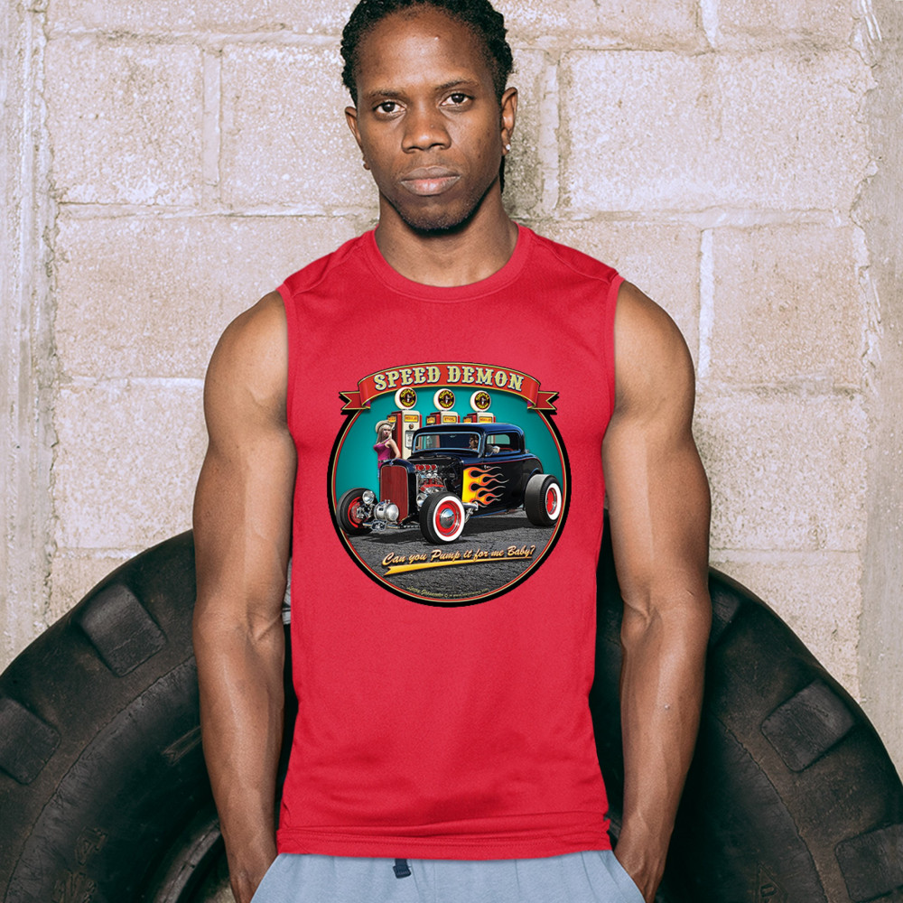 A print featuring a 1932 Ford Deuce hot rod coupe standing by a gas station. There is a cowgirl leaning on a gas pump. The print says: "speed demon" and underneath the car "Can you Pump it for me baby?". A great choice for Route 66 and hot rod fans.