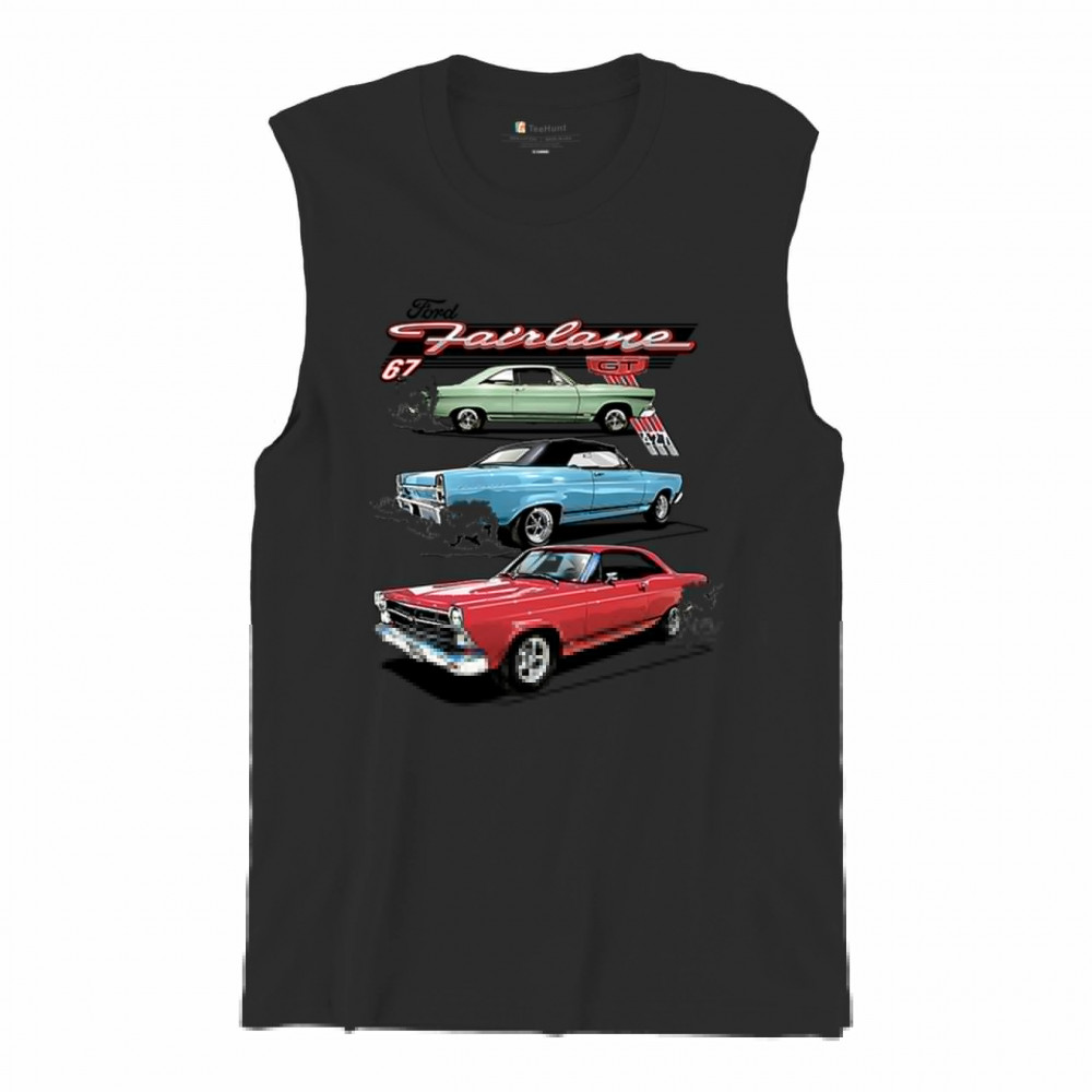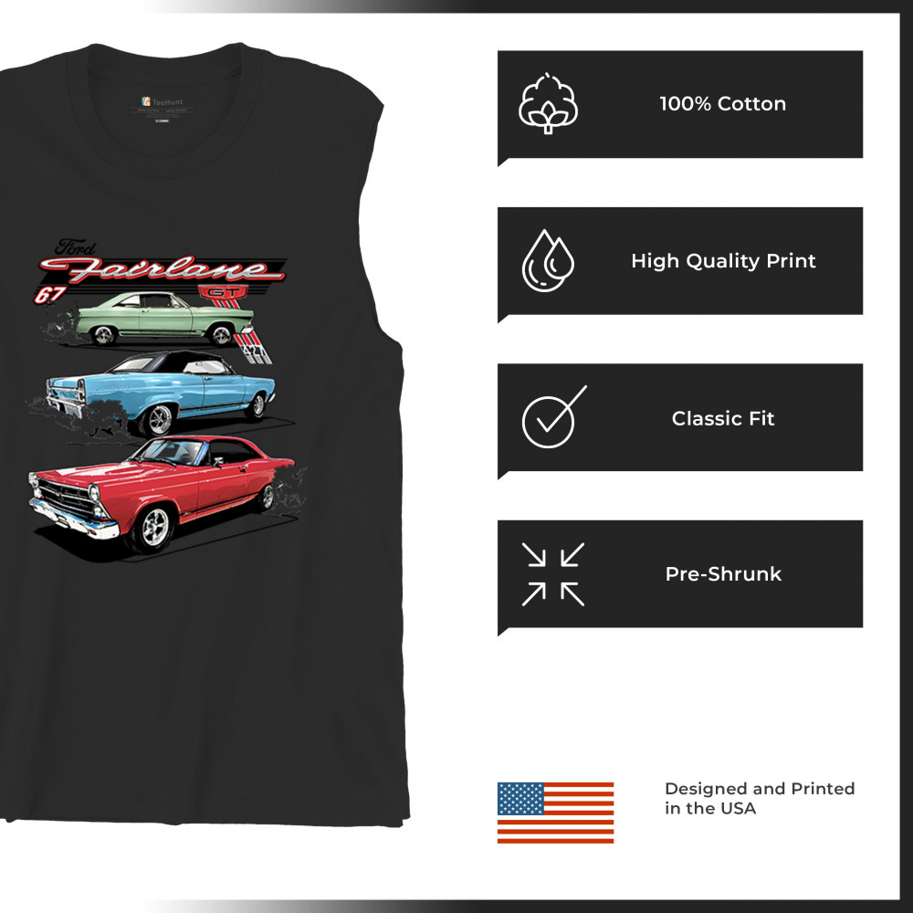Features three 1967 Ford Fairlane GTs with retro burnout style. Great for muscle car fans, Ford collectors, car shows, and vintage meetups.