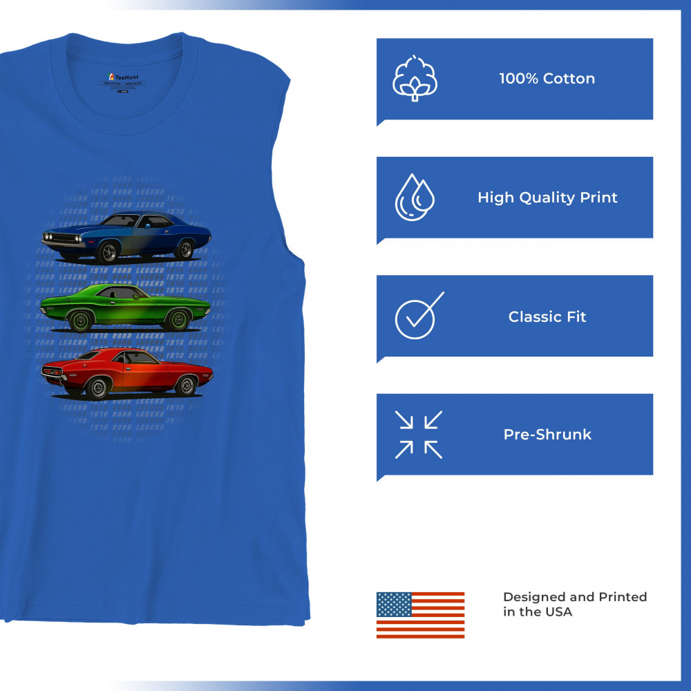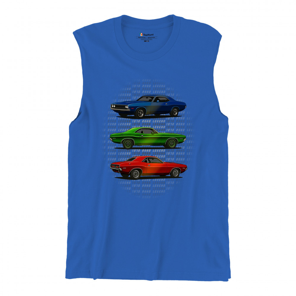 Three bold 1970 muscle cars, stacked in red, green, and blue, celebrate vintage power and road legend status. This retro-inspired design captures the essence of American car culture—made for gearheads, V8 fans, and anyone who lives for classic performance, heritage, and style.
