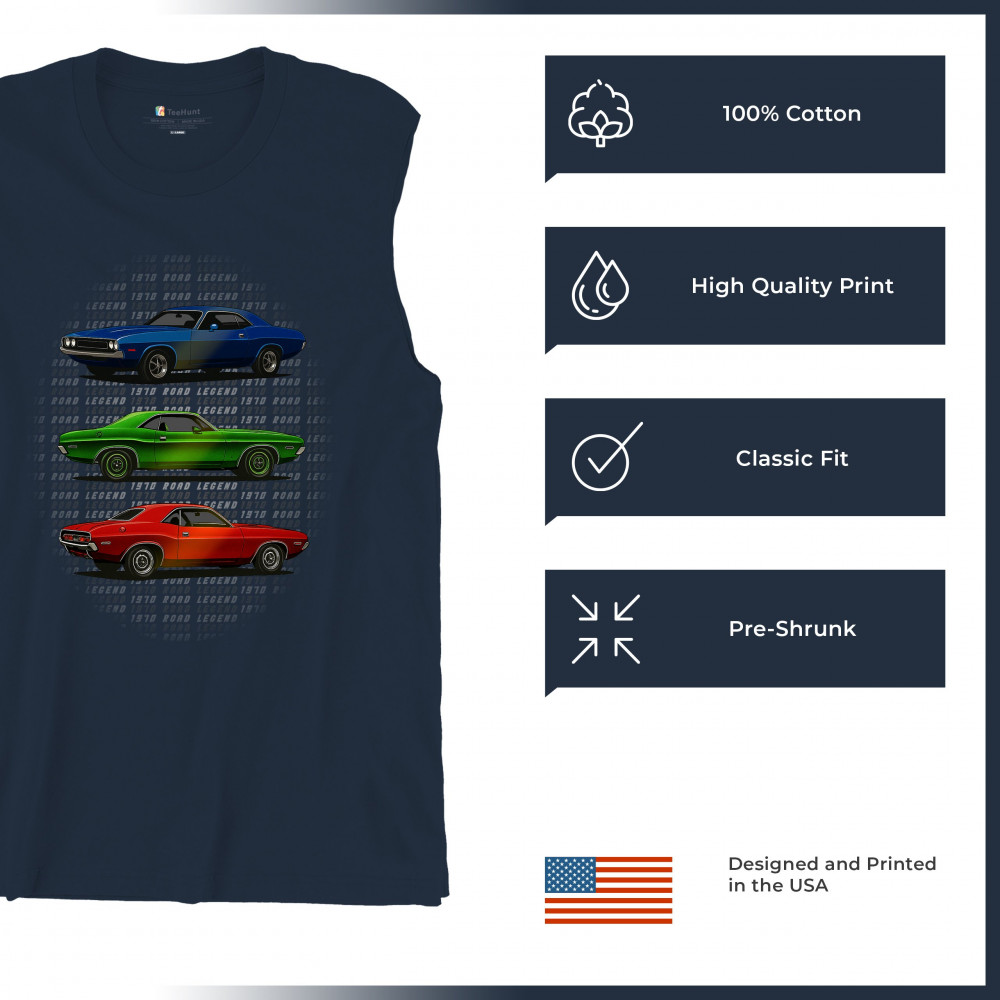 Three bold 1970 muscle cars, stacked in red, green, and blue, celebrate vintage power and road legend status. This retro-inspired design captures the essence of American car culture—made for gearheads, V8 fans, and anyone who lives for classic performance, heritage, and style.