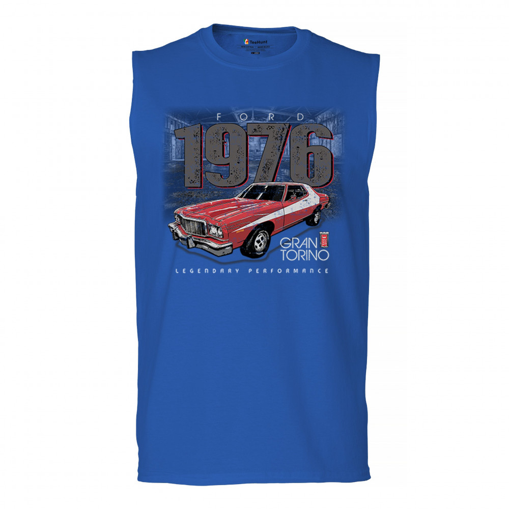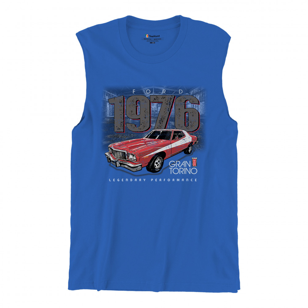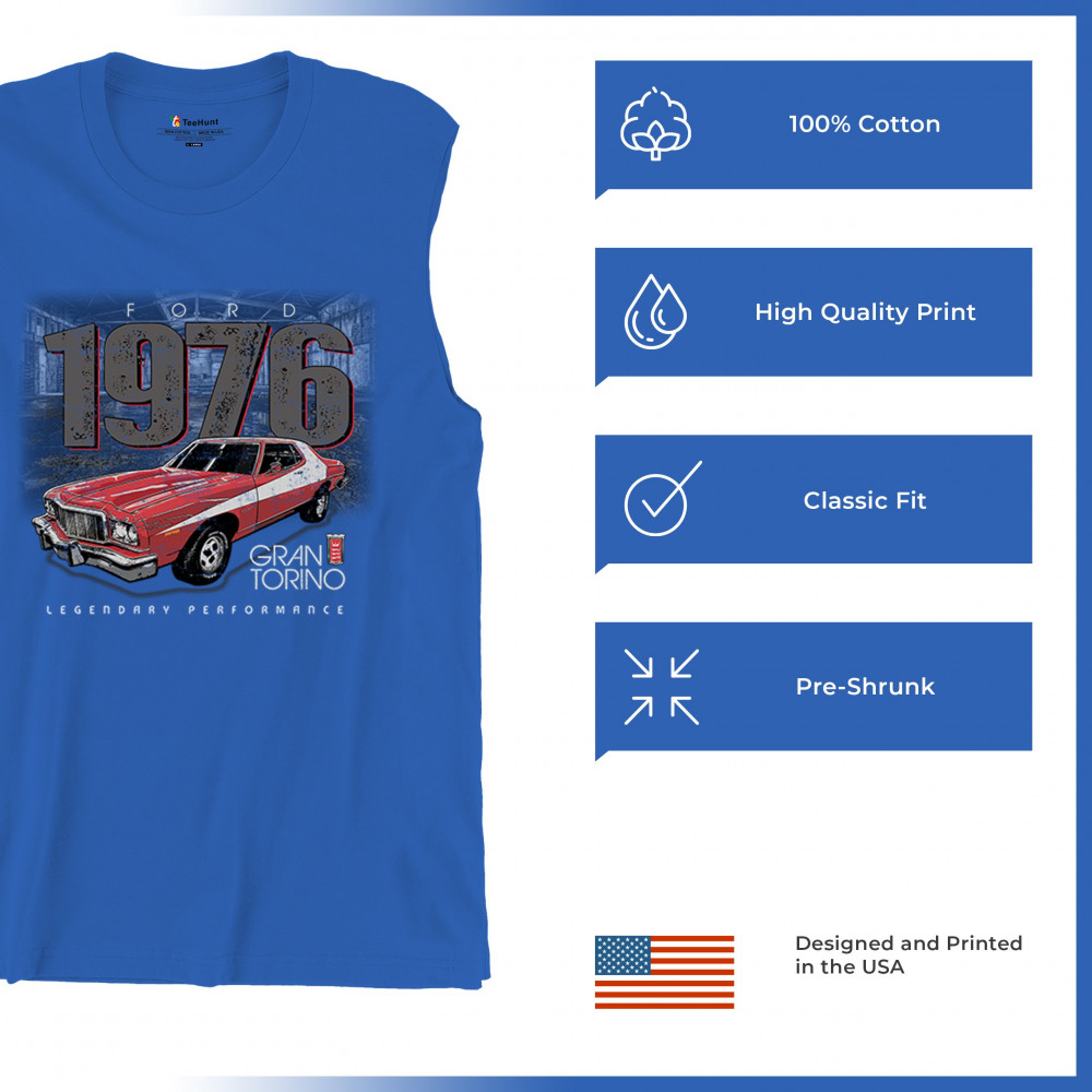1976 Ford Gran Torino design with red and white retro style. Perfect for muscle car fans, Ford lovers, and classic car event gear.