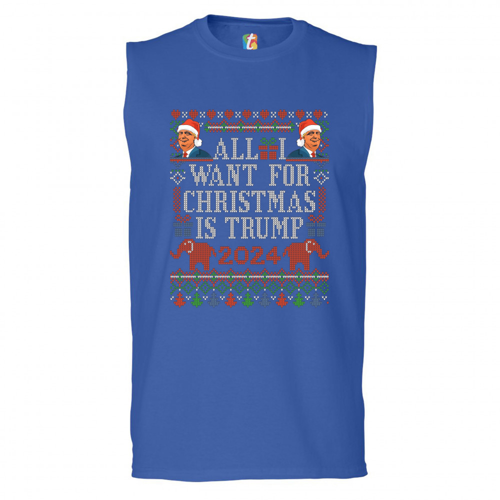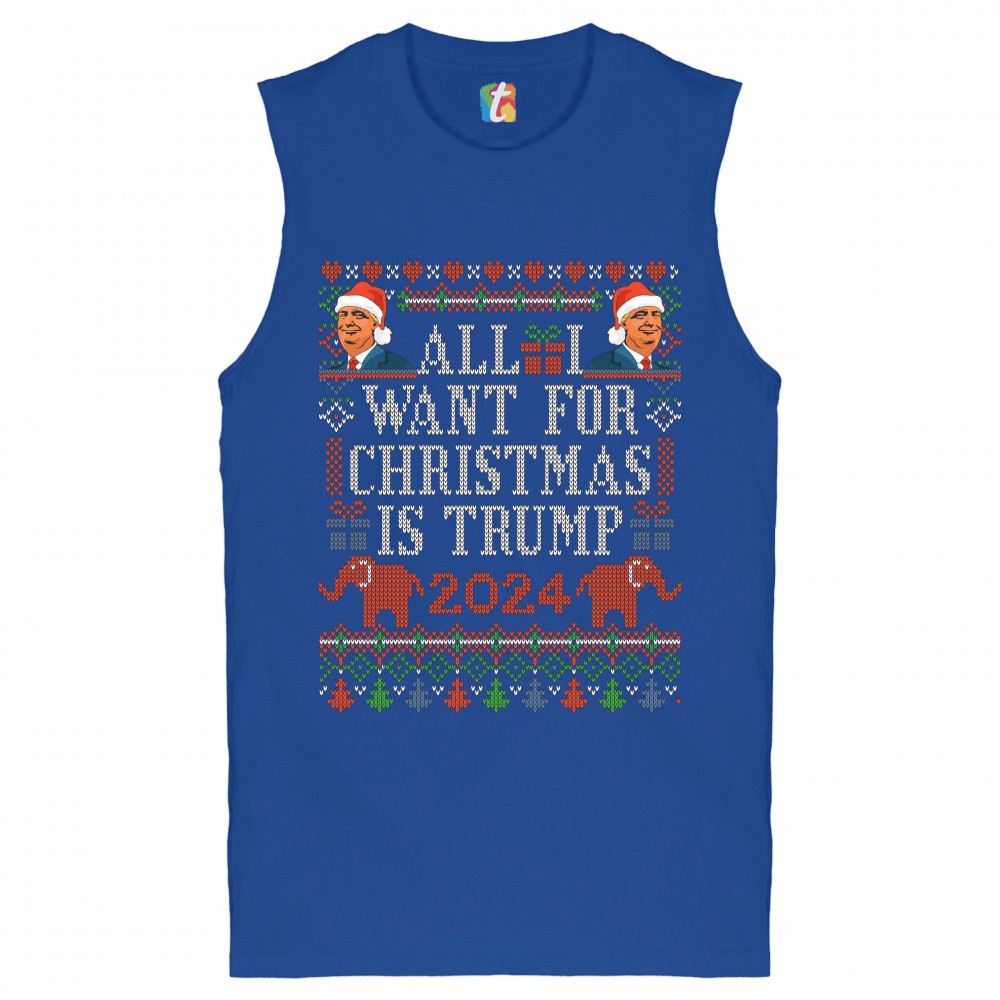 A funny print saying: "All I Want for Christmas Is Trump 2024". The print is decorated as a Christmas ugly sweater and features faces of Donald Trump wearing Christmas hats and two elephants. A great choice to wear for a Christmas or New Year's Eve party