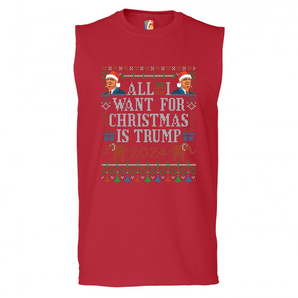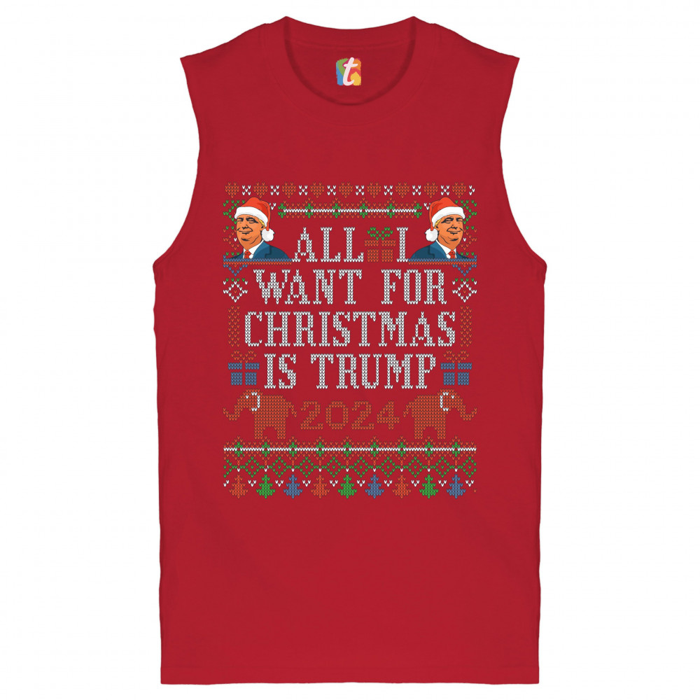 A funny print saying: "All I Want for Christmas Is Trump 2024". The print is decorated as a Christmas ugly sweater and features faces of Donald Trump wearing Christmas hats and two elephants. A great choice to wear for a Christmas or New Year's Eve party