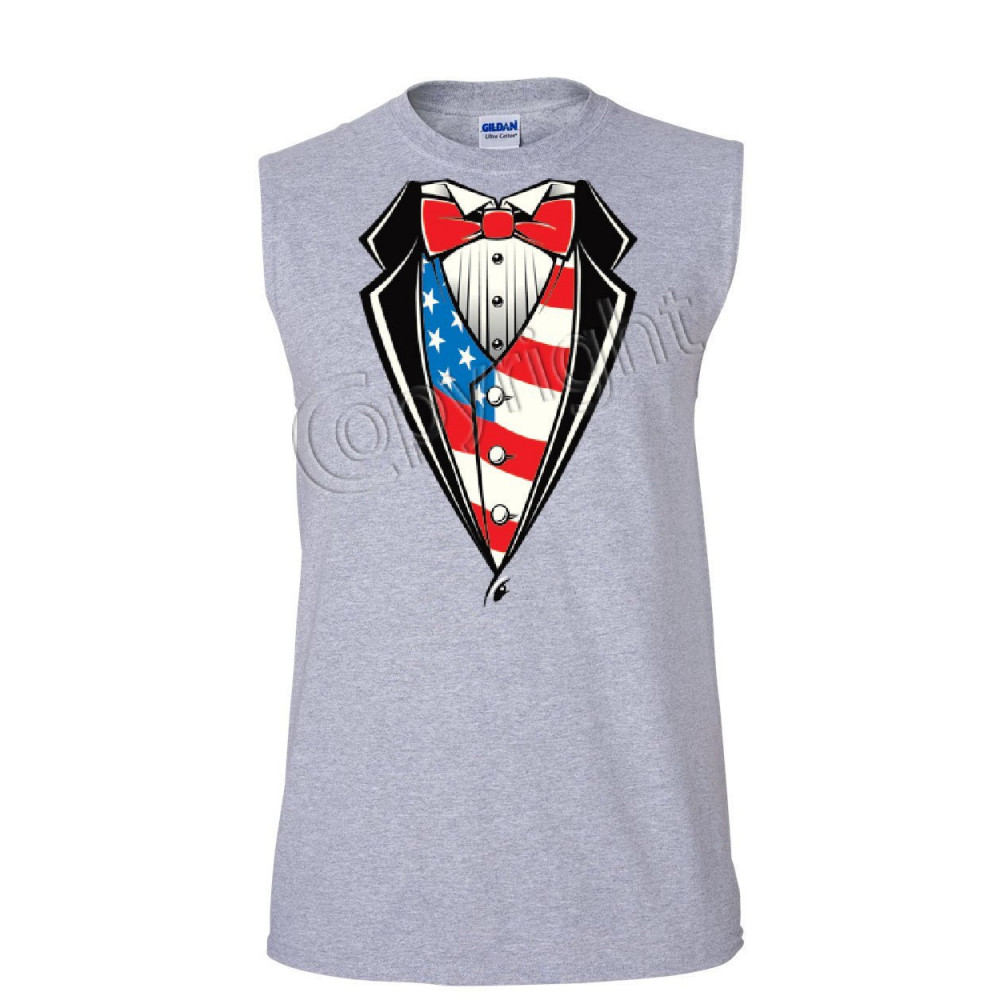 AMERICAN FLAG TUXEDO muscle shirt funny 4th of july stars and stripes sleeveless gray