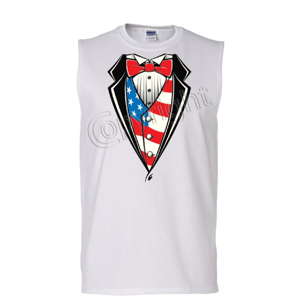 AMERICAN FLAG TUXEDO muscle shirt funny 4th of july stars and stripes sleeveless white