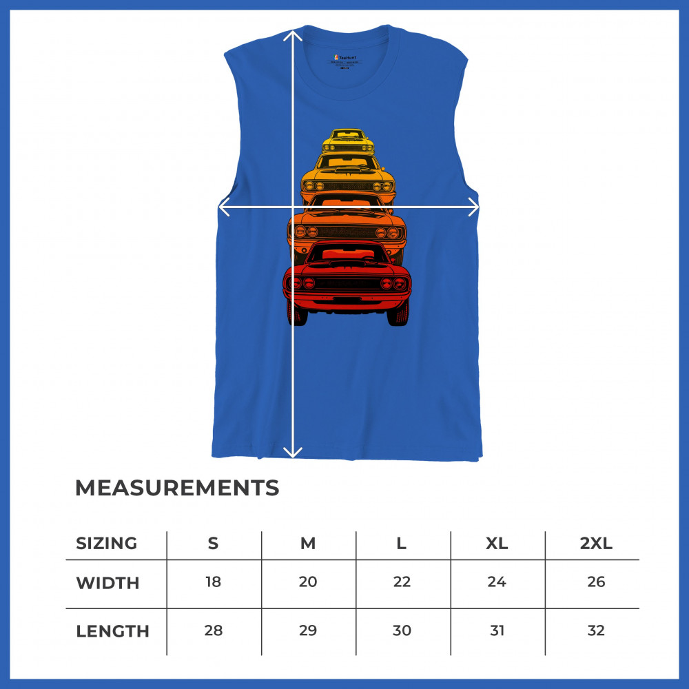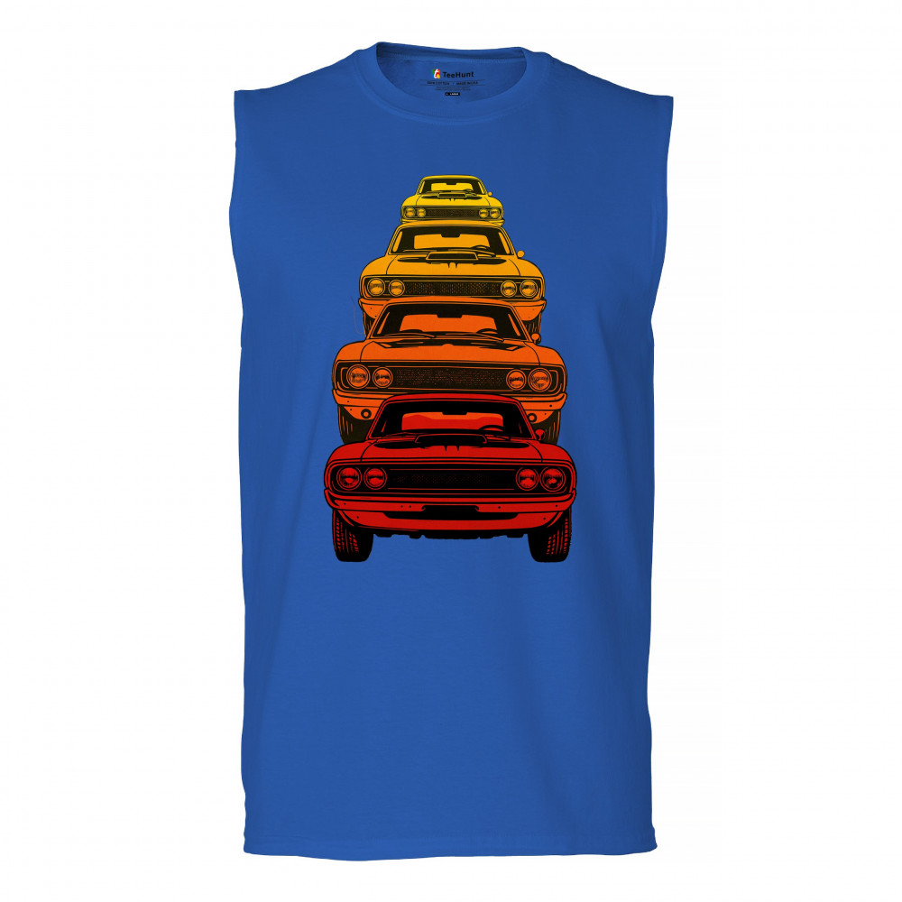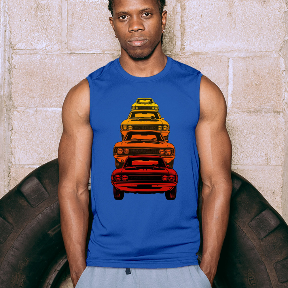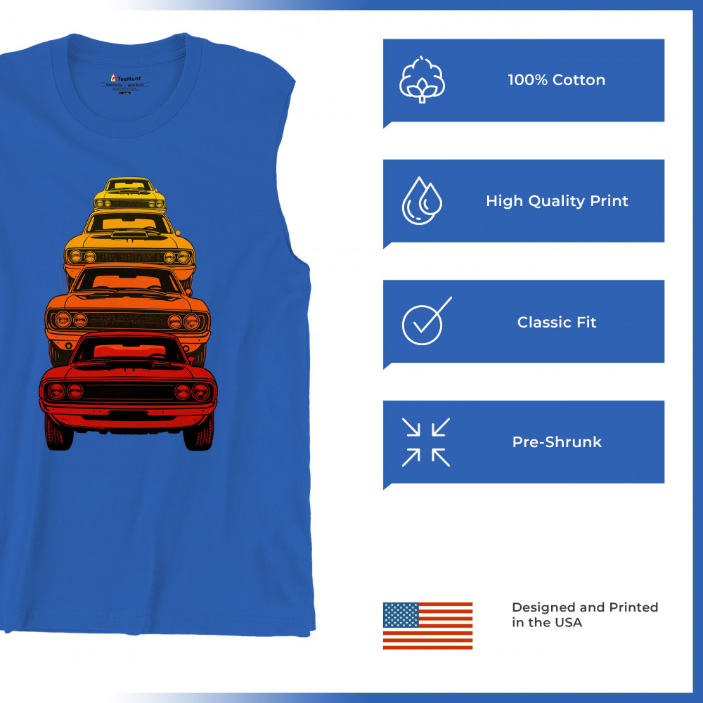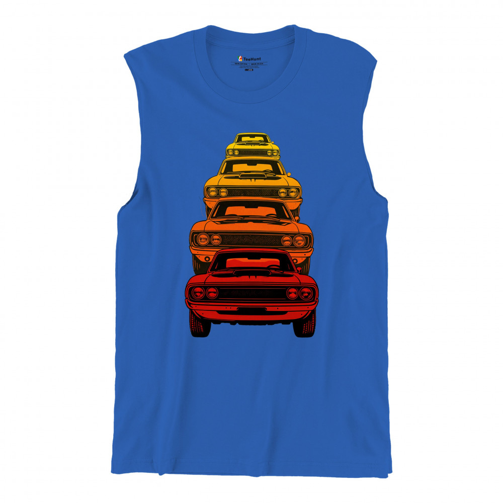 Celebrate horsepower heritage with this colorful lineup of classic muscle cars. Featuring a stacked gradient from red to yellow, this design brings bold retro attitude, V8 pride, and American torque to life. Perfect for collectors, gearheads, and fans of classic car power.