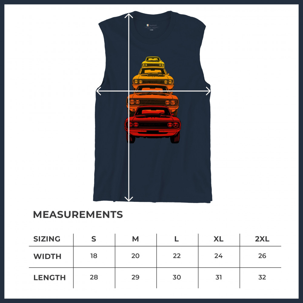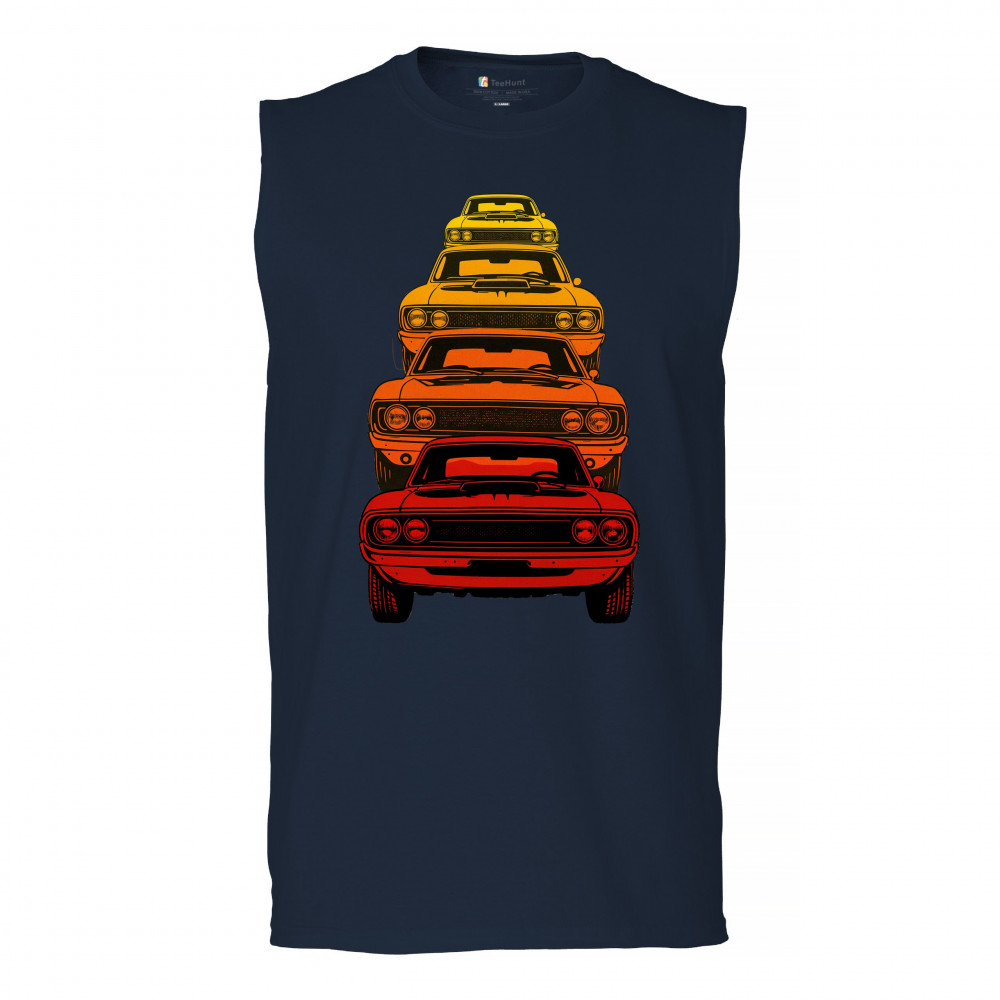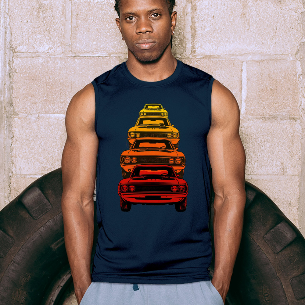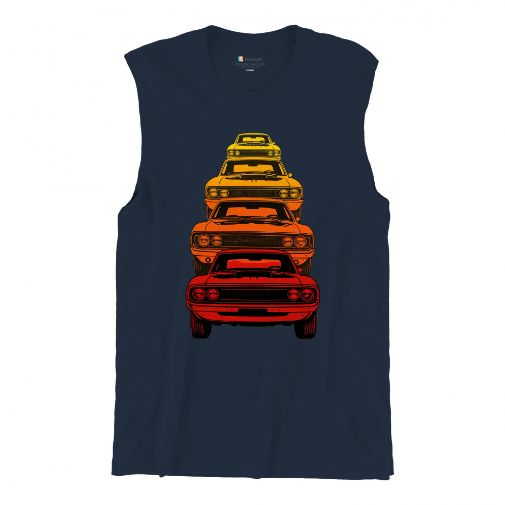 Celebrate horsepower heritage with this colorful lineup of classic muscle cars. Featuring a stacked gradient from red to yellow, this design brings bold retro attitude, V8 pride, and American torque to life. Perfect for collectors, gearheads, and fans of classic car power.