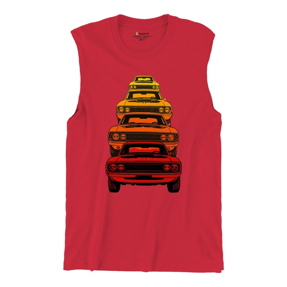 Celebrate horsepower heritage with this colorful lineup of classic muscle cars. Featuring a stacked gradient from red to yellow, this design brings bold retro attitude, V8 pride, and American torque to life. Perfect for collectors, gearheads, and fans of classic car power.
