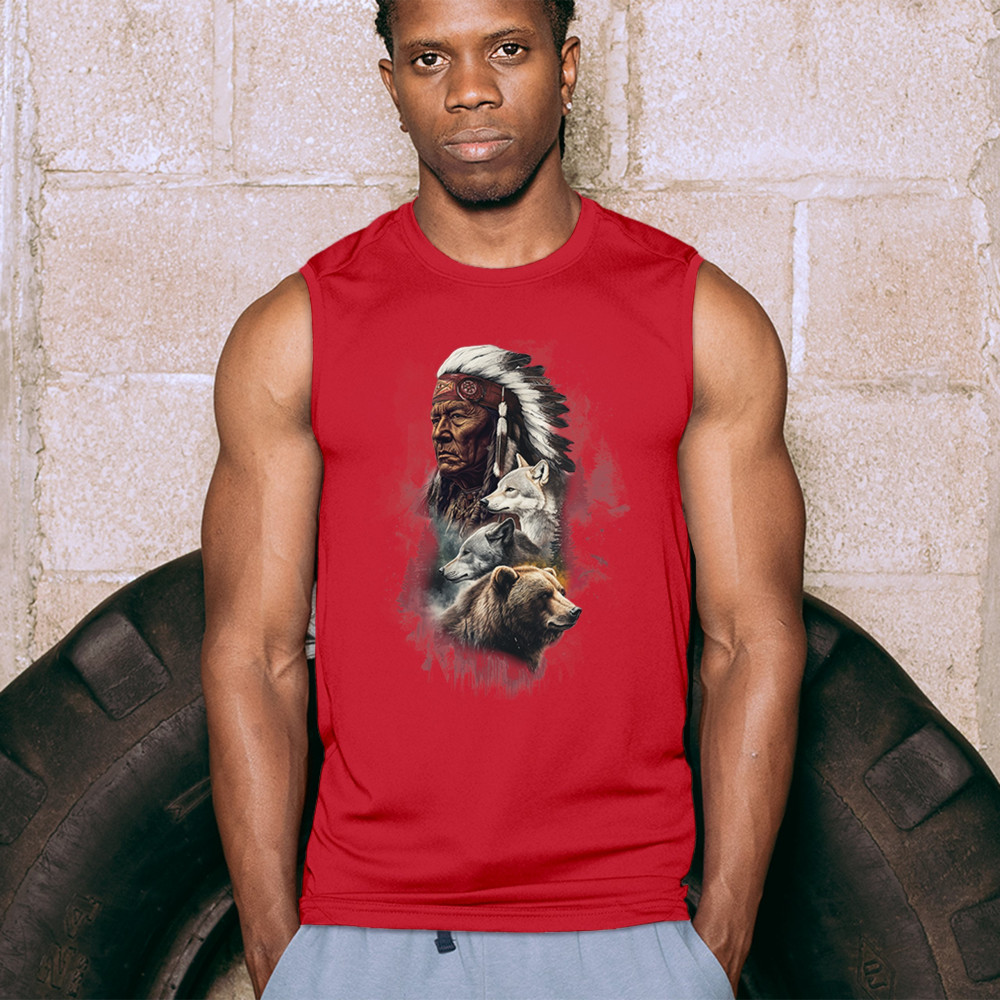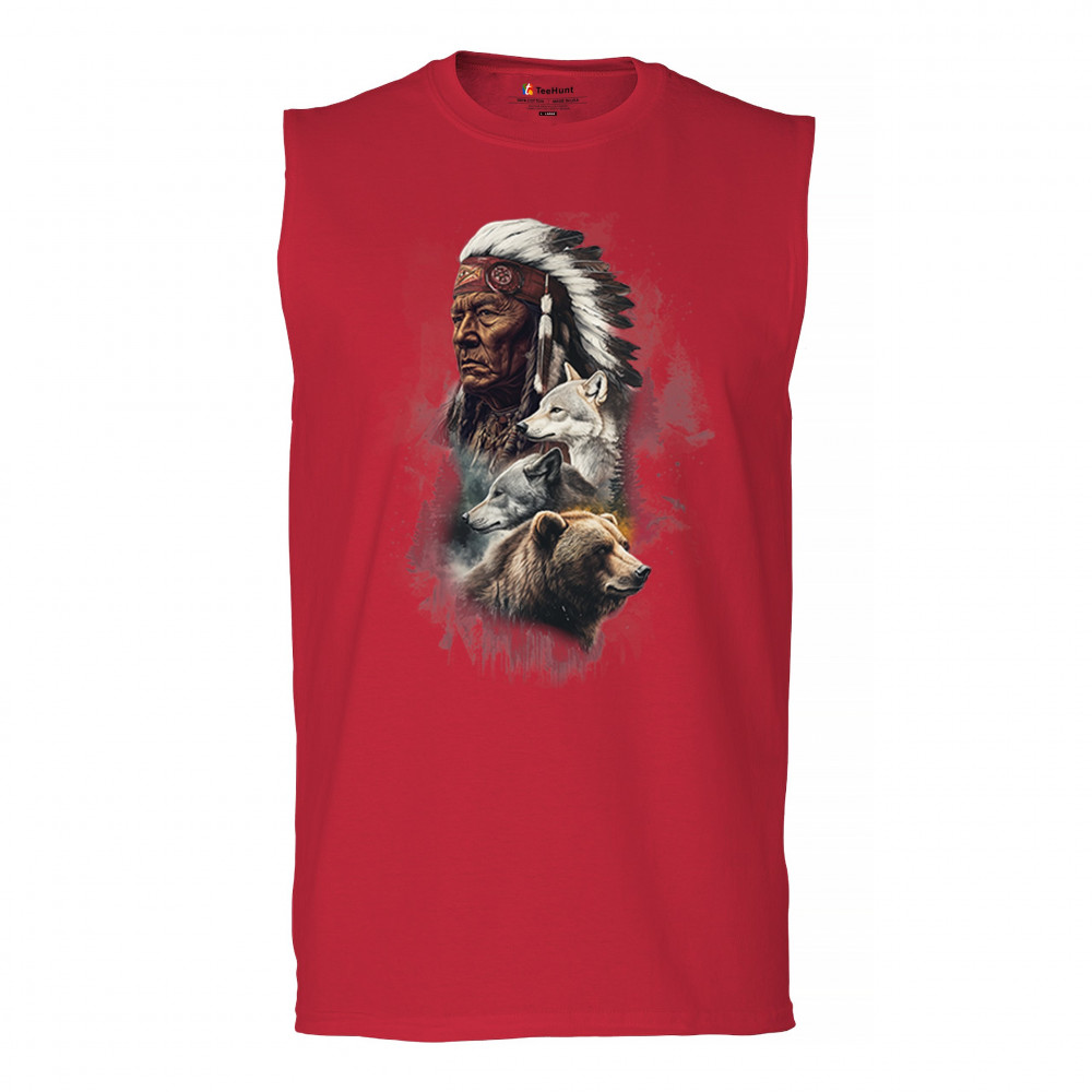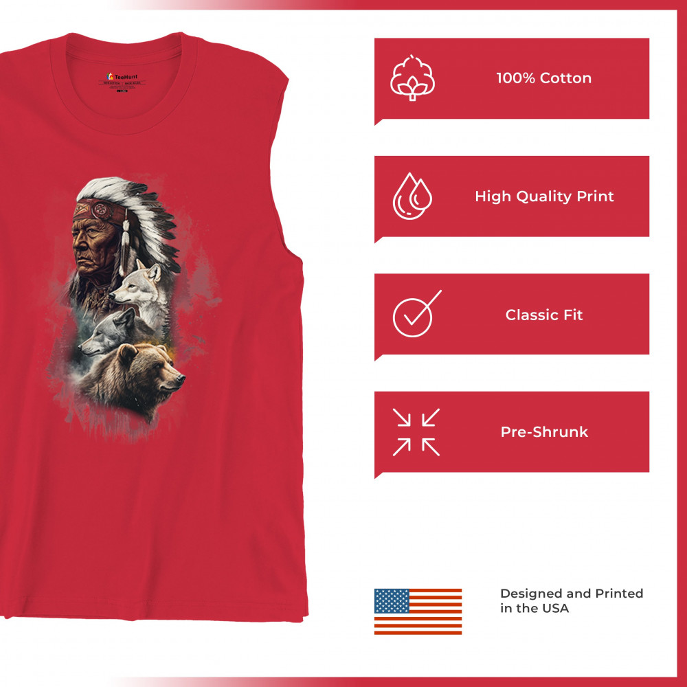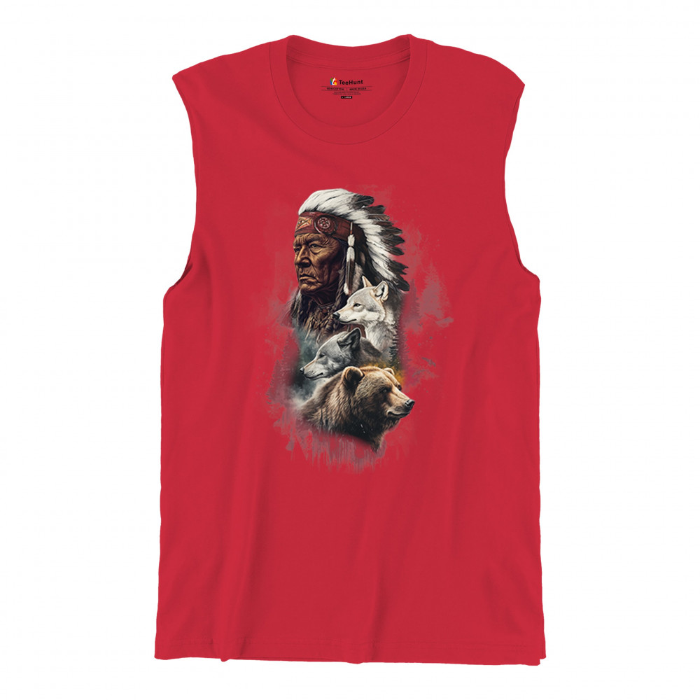 Celebrate spiritual strength and heritage with this design featuring a Native American elder alongside wolves and a bear. This tribal and totemic art reflects wisdom, guardianship, and deep forest spirit energy. Perfect for cultural pride, animal lovers, and those connected to spiritual symbolism in nature.