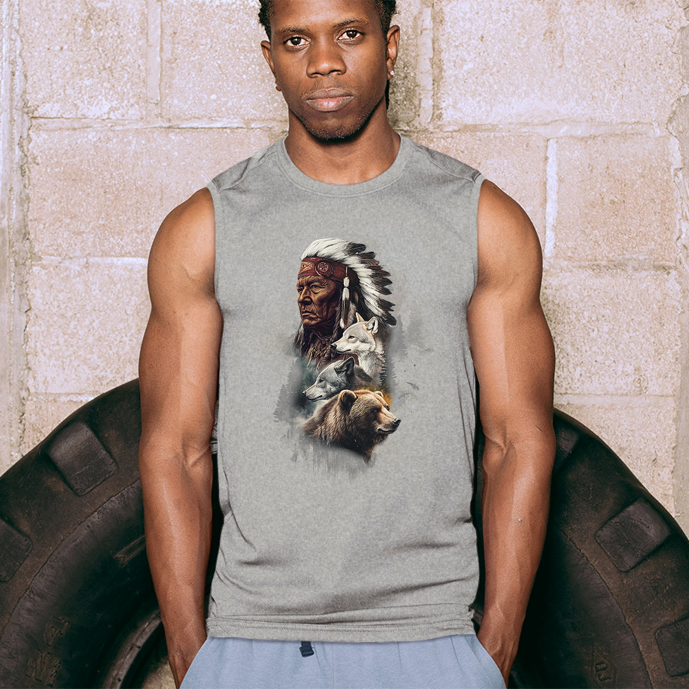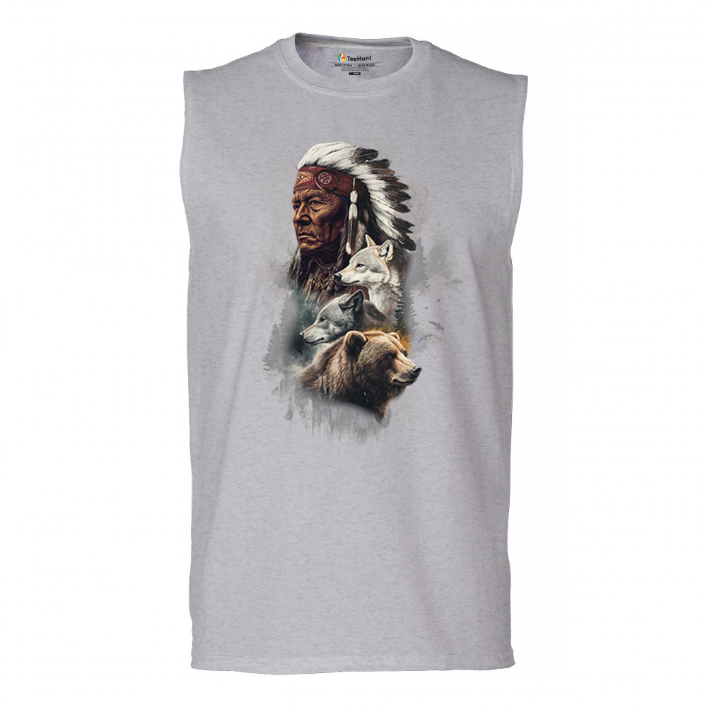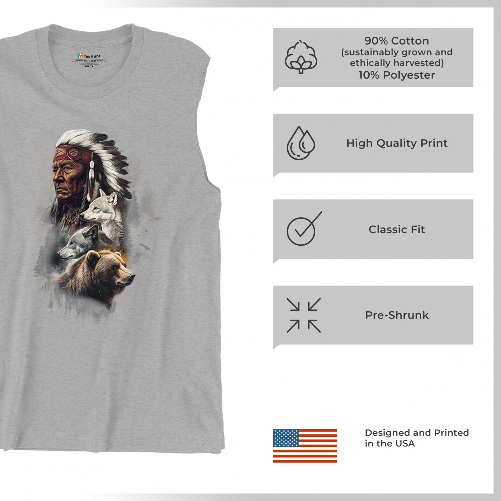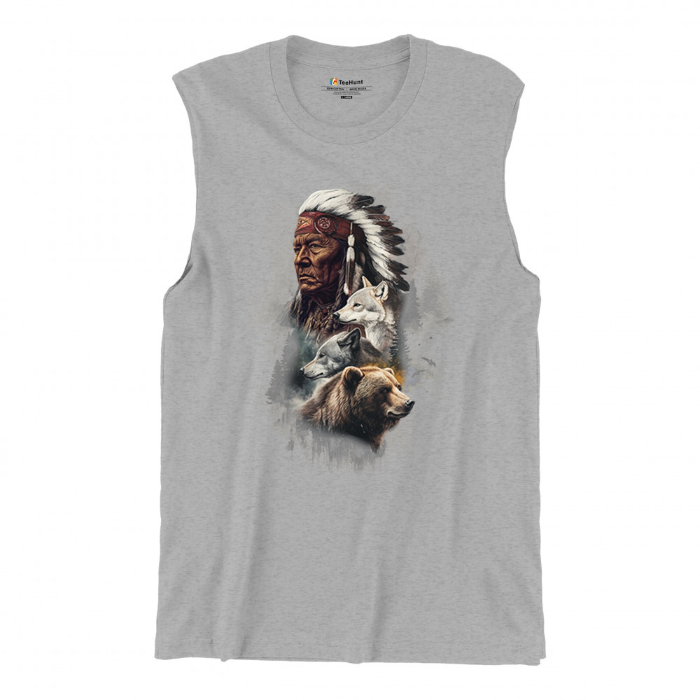 Celebrate spiritual strength and heritage with this design featuring a Native American elder alongside wolves and a bear. This tribal and totemic art reflects wisdom, guardianship, and deep forest spirit energy. Perfect for cultural pride, animal lovers, and those connected to spiritual symbolism in nature.
