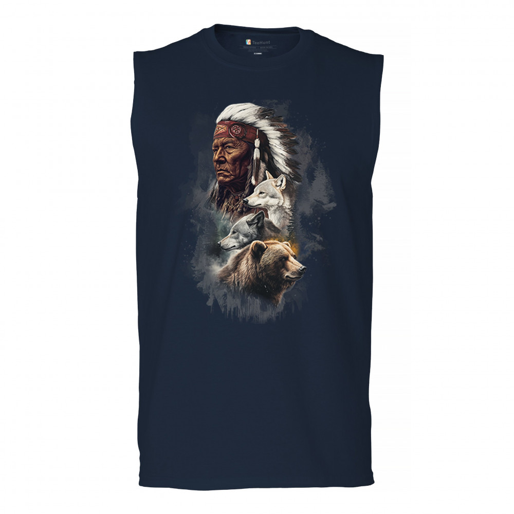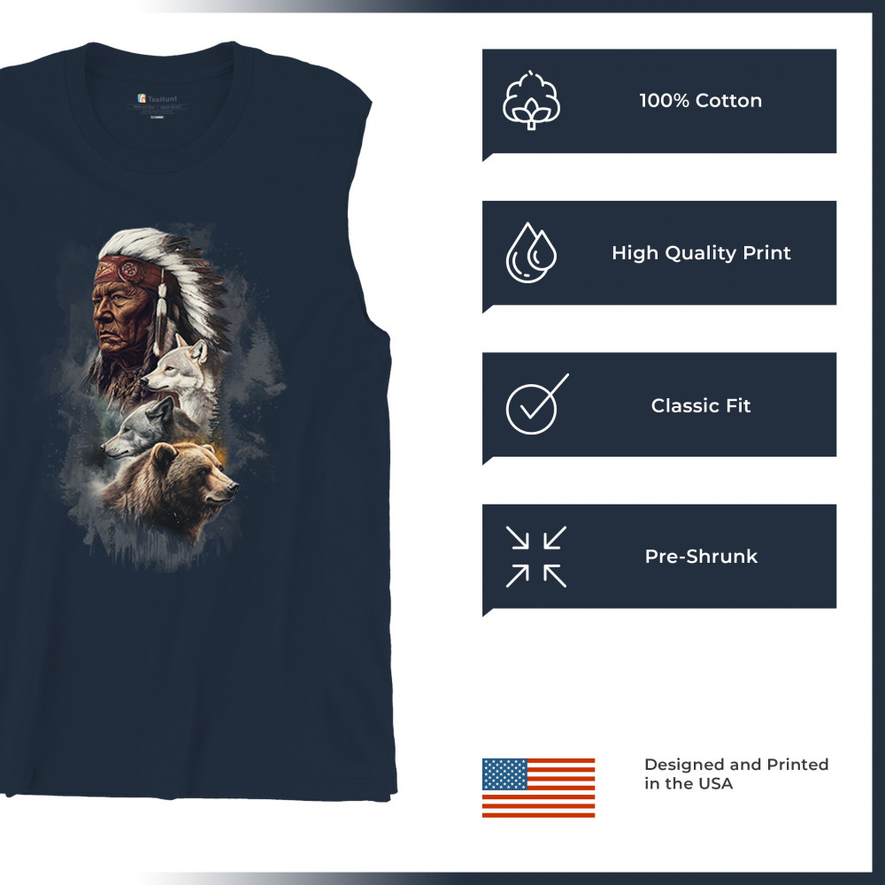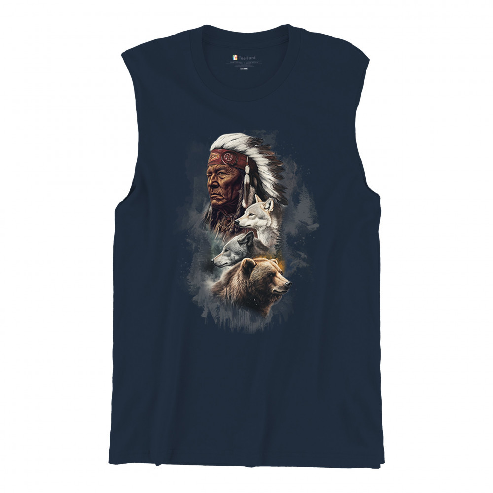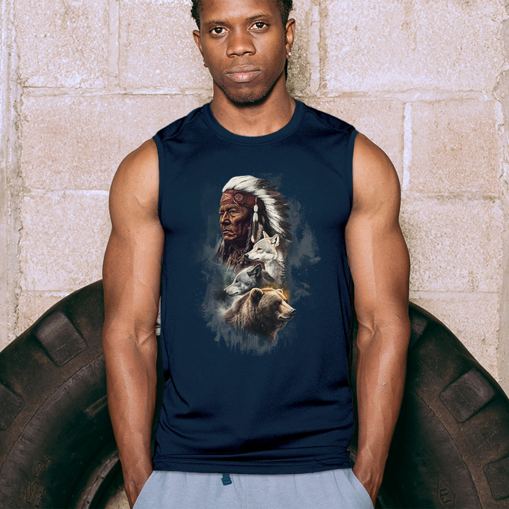 Celebrate spiritual strength and heritage with this design featuring a Native American elder alongside wolves and a bear. This tribal and totemic art reflects wisdom, guardianship, and deep forest spirit energy. Perfect for cultural pride, animal lovers, and those connected to spiritual symbolism in nature.