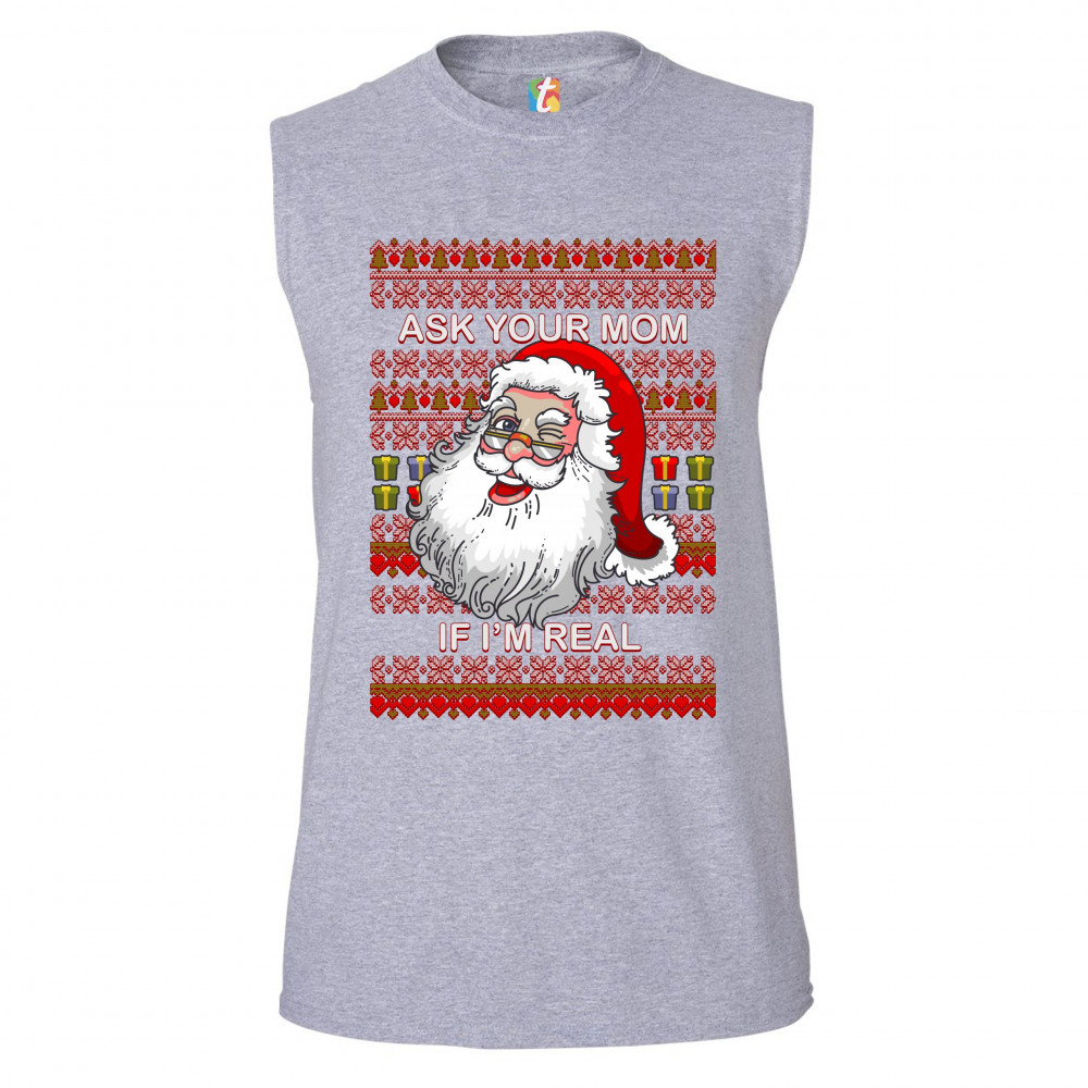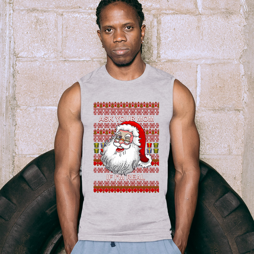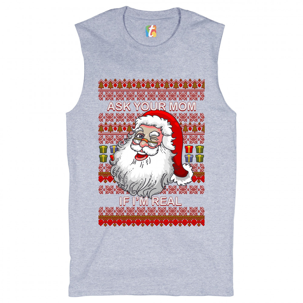 ASK YOUR MOM IF I'M REAL muscle shirt ugly sweater christmas santa claus men's gray