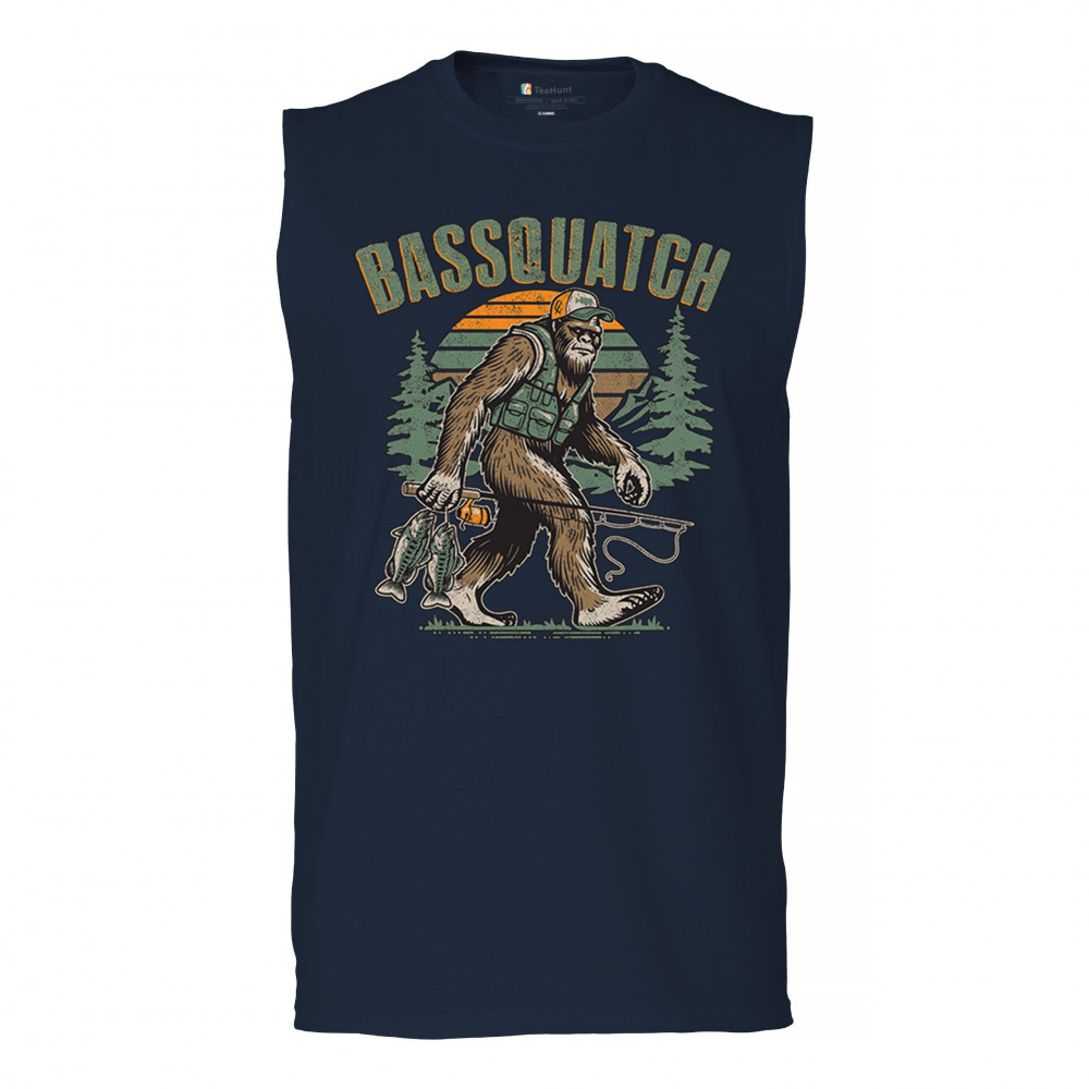 Funny Bassquatch design blends Bigfoot, fishing humor, and retro forest style. Great for anglers, cryptid lovers, and outdoorsy pun fans.