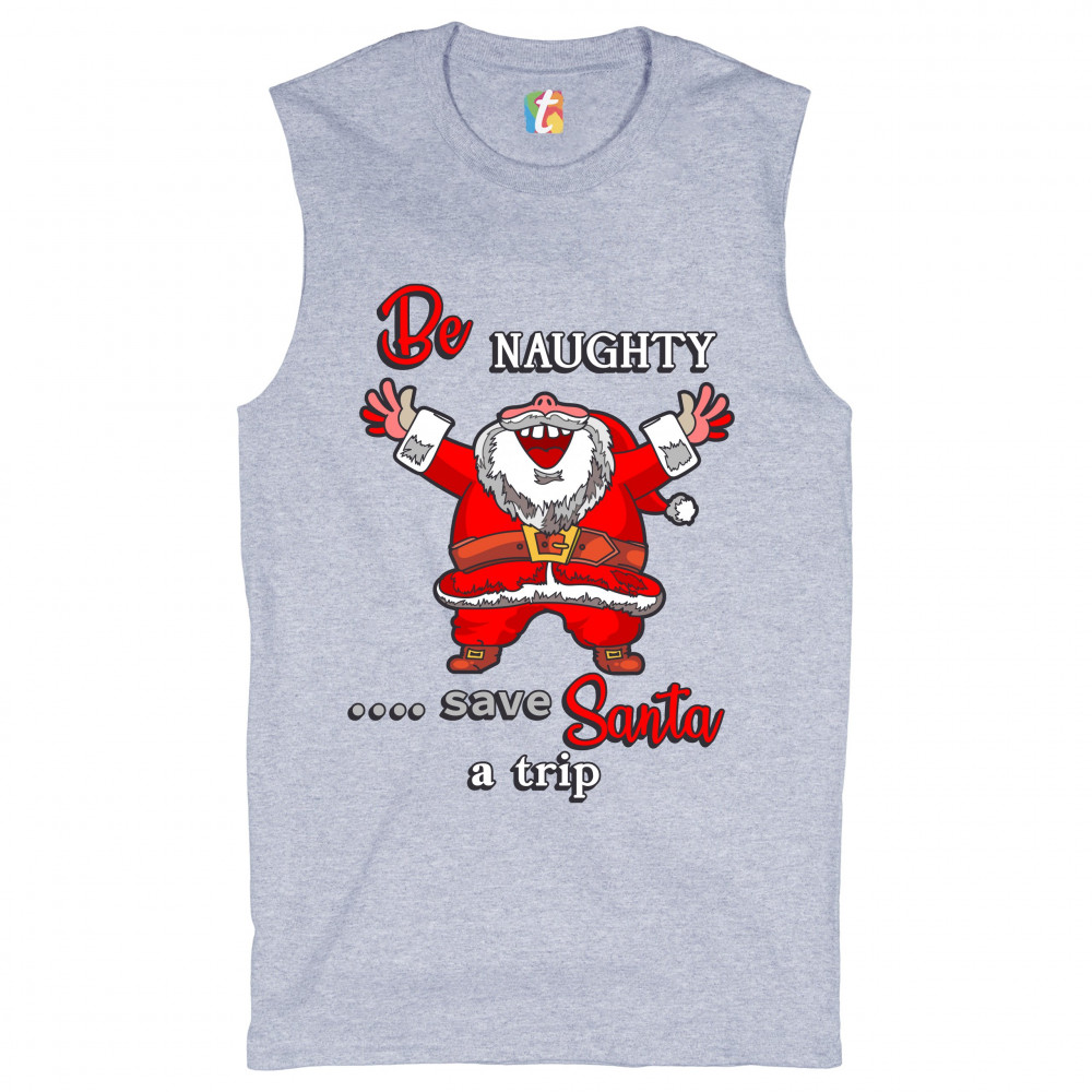 BE NAUGHTY SAVE SANTA A TRIP muscle shirt holiday spirit christmas eve men's gray