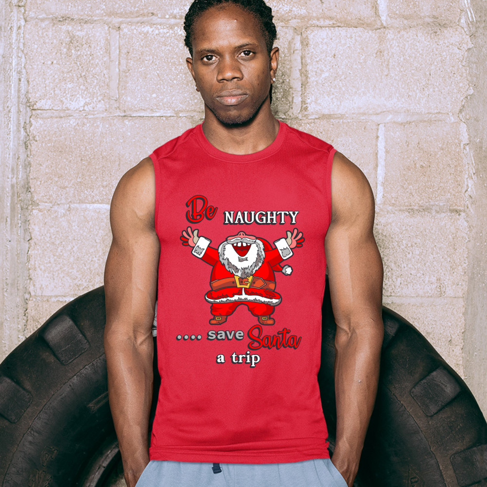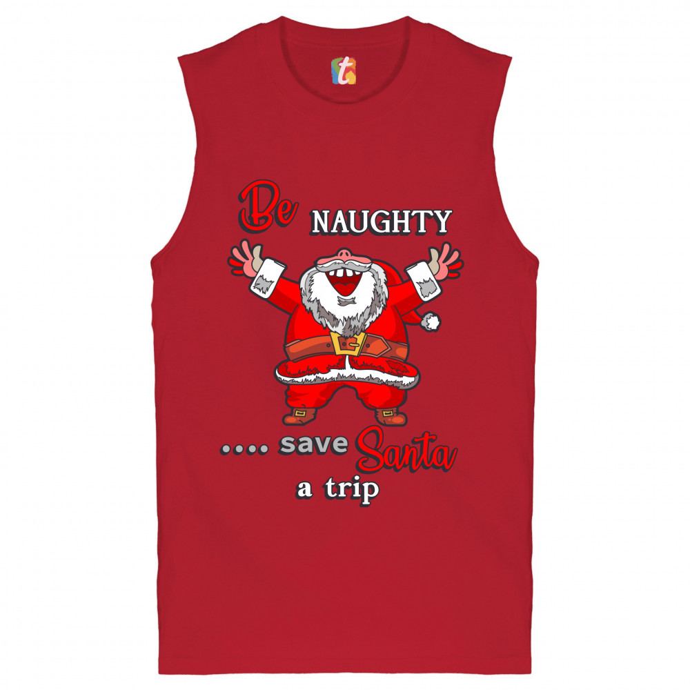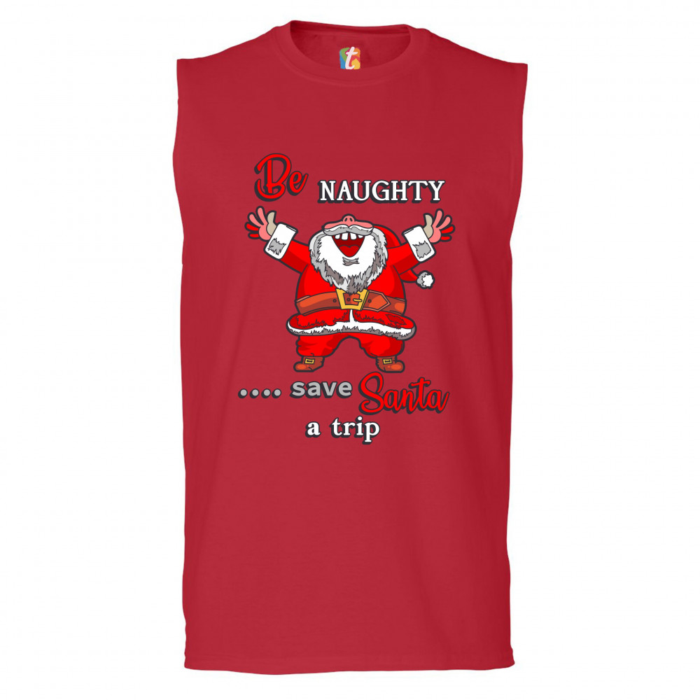 BE NAUGHTY SAVE SANTA A TRIP muscle shirt holiday spirit christmas eve men's red