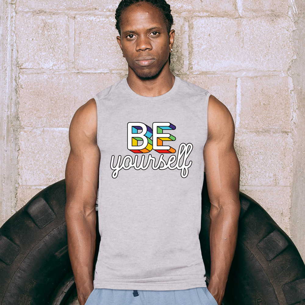 BE YOURSELF muscle shirt lgbt support gay pride rainbow good vibes ally men's gray