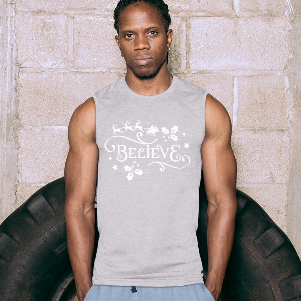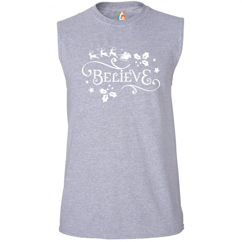 BELIEVE muscle shirt merry christmas santa sleigh rudolph mistletoe men's gray