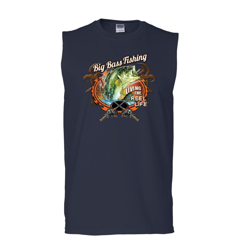 BIG BASS FISHING muscle shirt living the reel life fisherman spinning sleeveless navy blue