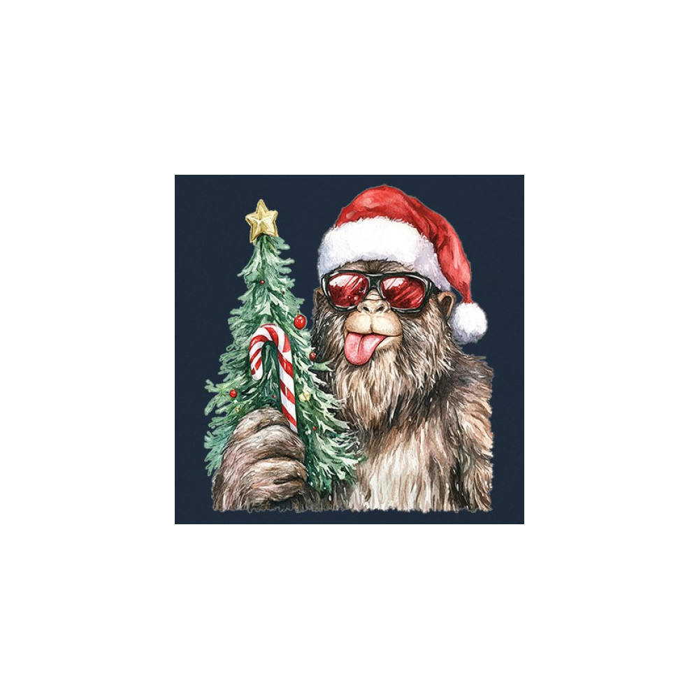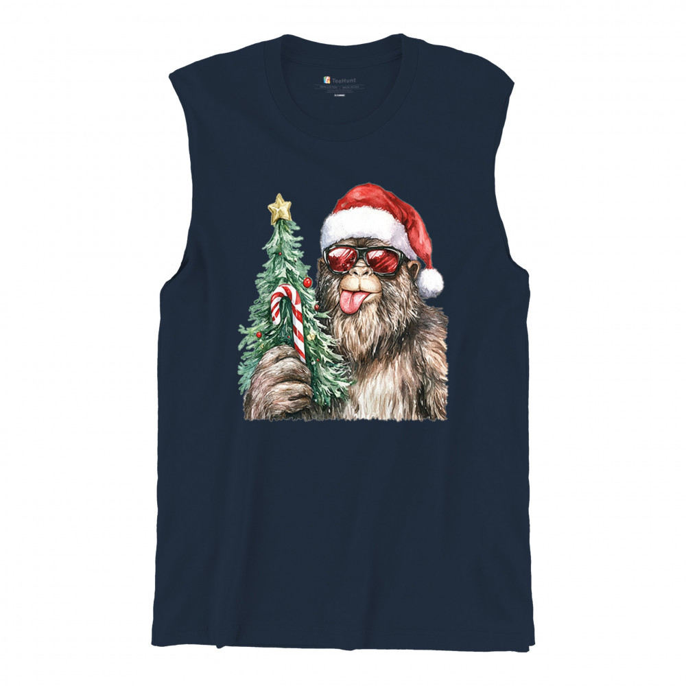 Bigfoot Christmas Santa shirt – festive Sasquatch holiday humor tee with Santa hat design, Xmas tree, candy cane, and funny Christmas style.