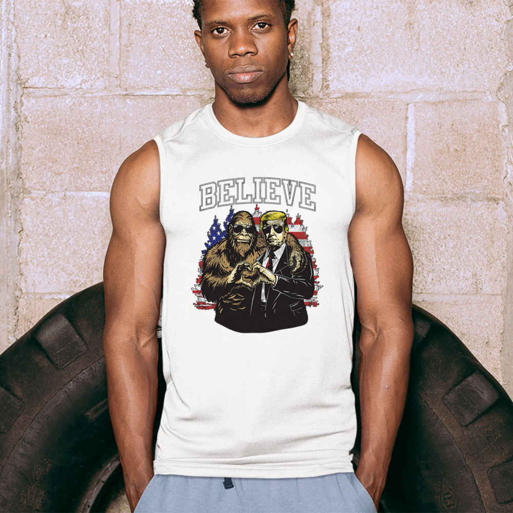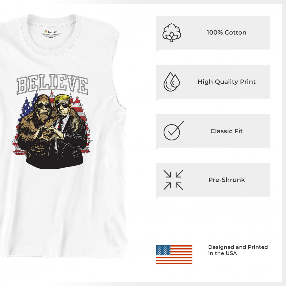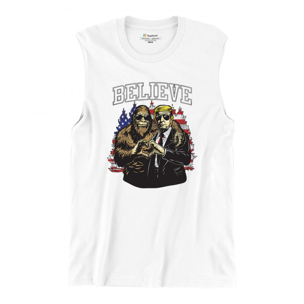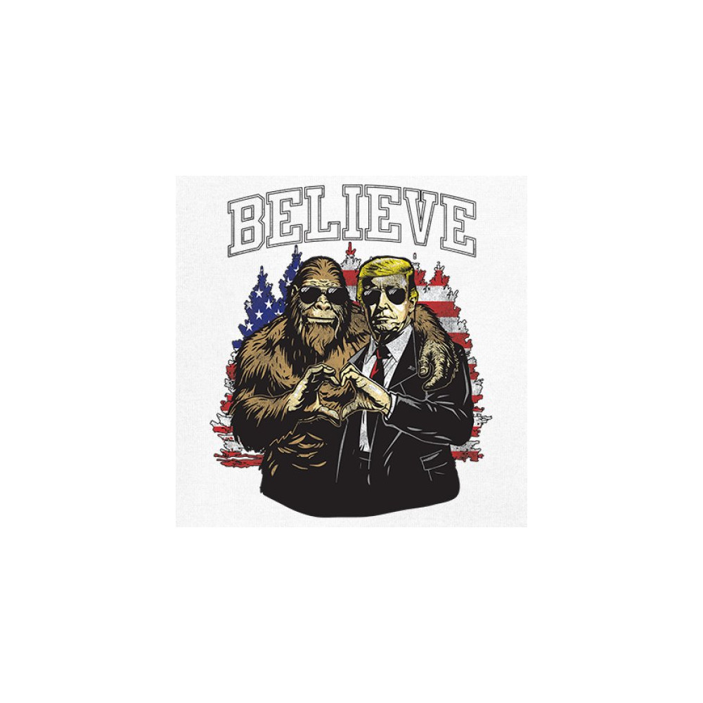 The "Believe" design combines patriotic pride and conservative values with a touch of fun. Featuring Donald J. Trump and a loyal Bigfoot against the American flag, this graphic is perfect for Trump supporters, Republicans, and believers in America First. Celebrate the Red Wave, the 47th President, and the unstoppable fight for victory. Ideal for anyone with unwavering belief in the people's mandate.
