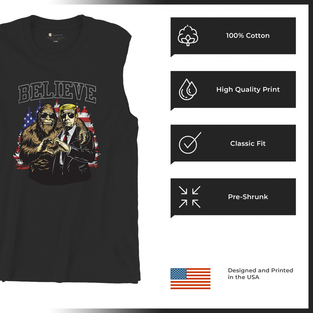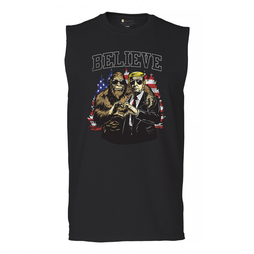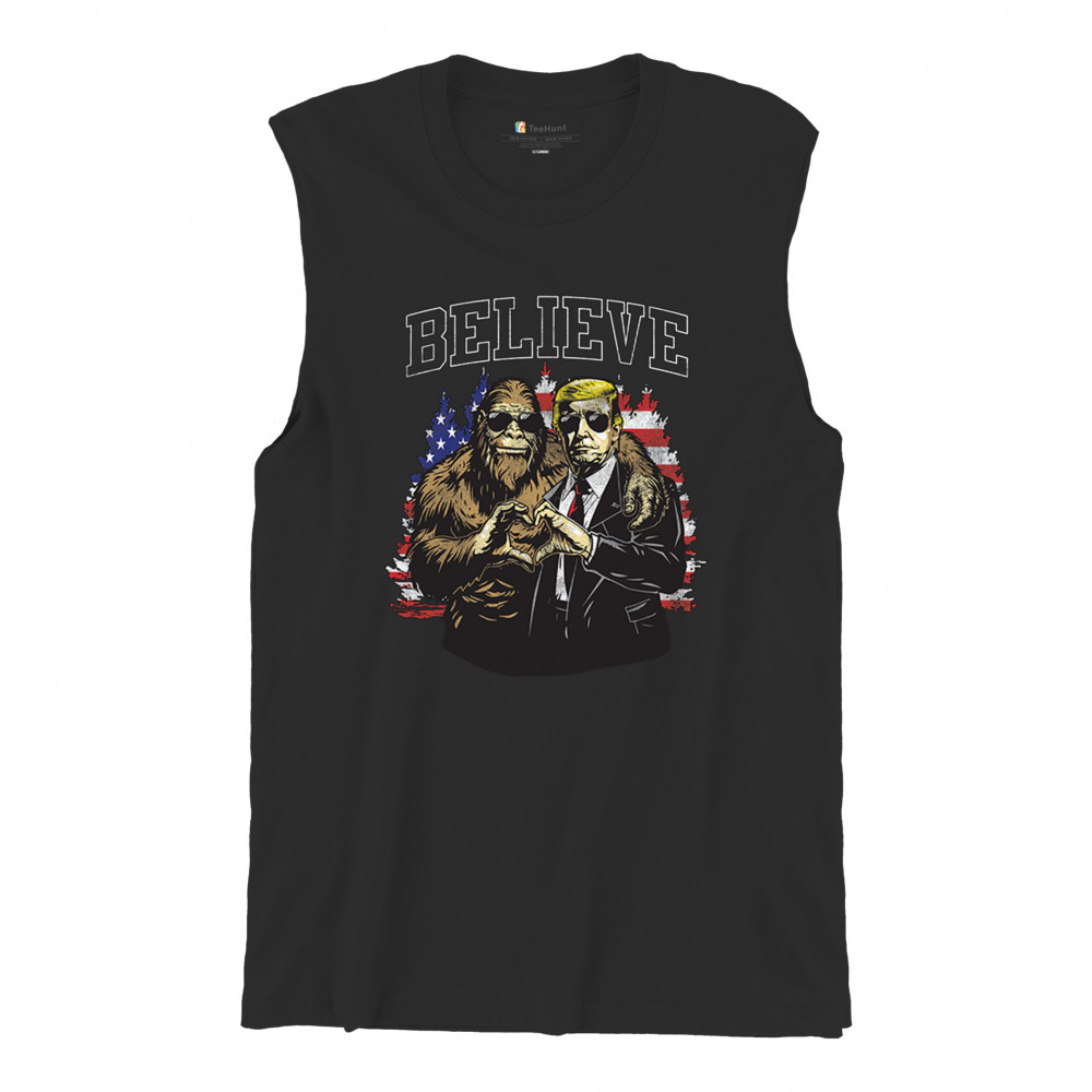 The "Believe" design combines patriotic pride and conservative values with a touch of fun. Featuring Donald J. Trump and a loyal Bigfoot against the American flag, this graphic is perfect for Trump supporters, Republicans, and believers in America First. Celebrate the Red Wave, the 47th President, and the unstoppable fight for victory. Ideal for anyone with unwavering belief in the people's mandate.